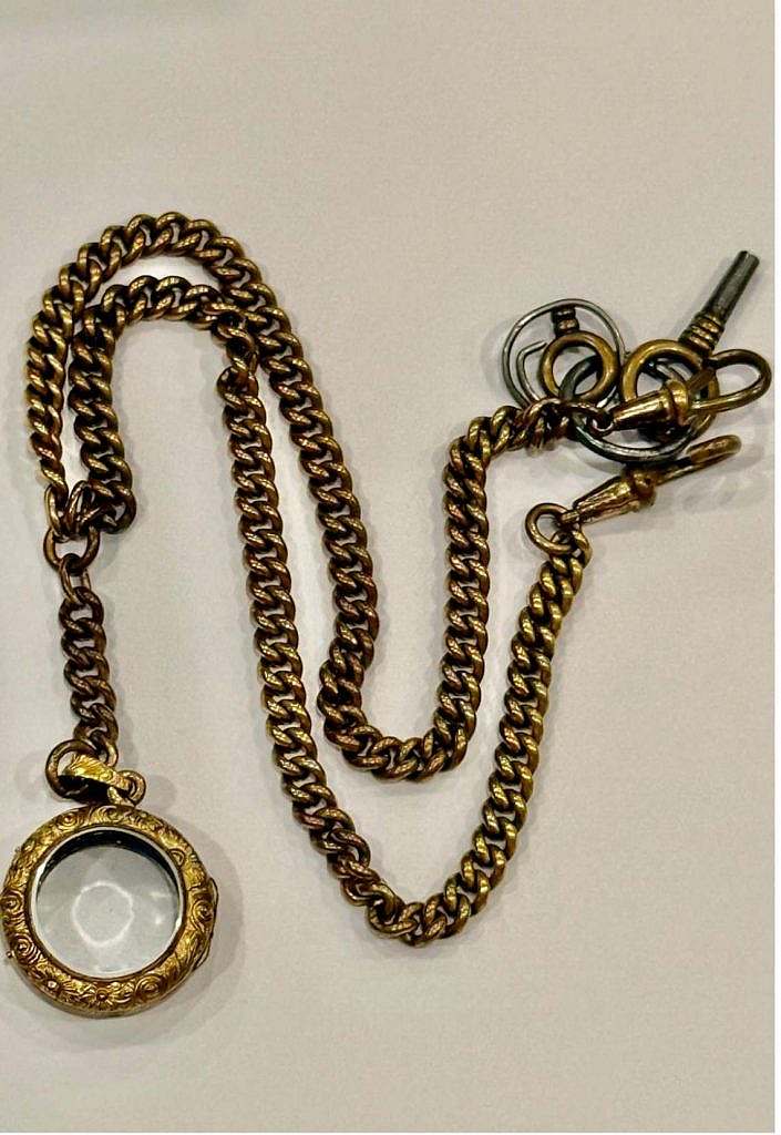 Cadena inglesa de latón sobredorado del año 1750 formada por una cadena a eslabones gruesa dotada de camafeo para relicario, la cual se remata en un extremo en un gancho provisto de cierre de seguridad para el reloj y de otro para el cierre y ensamblaje con el ropaje de la época. El objeto de estas cadenas era: 1º Evitar que se cayera el reloj al suelo cuando se visualizaba la hora; 2º Evitar la pérdida del reloj; 3º Decorar el chaleco y vestimenta, dando más realce al caballero 4- A través de la camafeo para reliquia sentirse protegido.