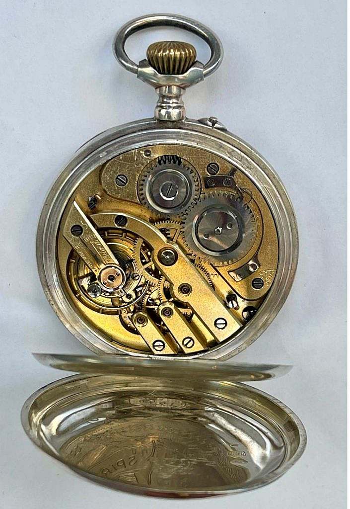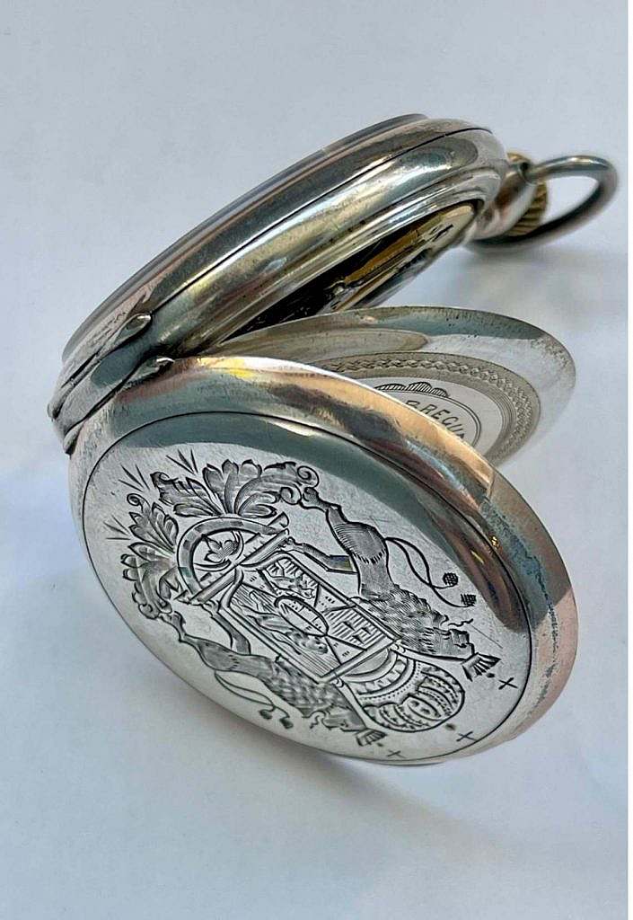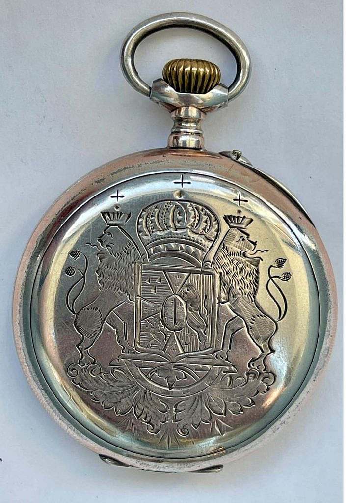 Inusual reloj de bolsillo en plata de ley con el Escudo de la Unión personal de Suecia y Noruega (1844-1905).La unión entre Suecia y Noruega fue la unión personal de los reinos de Suecia y Noruega entre los años 1814 y 1905.