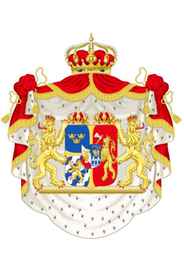 Armas de Suecia y Casa de Bjälbo, Noruega (segunda partición), Casa de Bjälbo. En escusón: Casa de Vasa y Casa de Bernadotte.