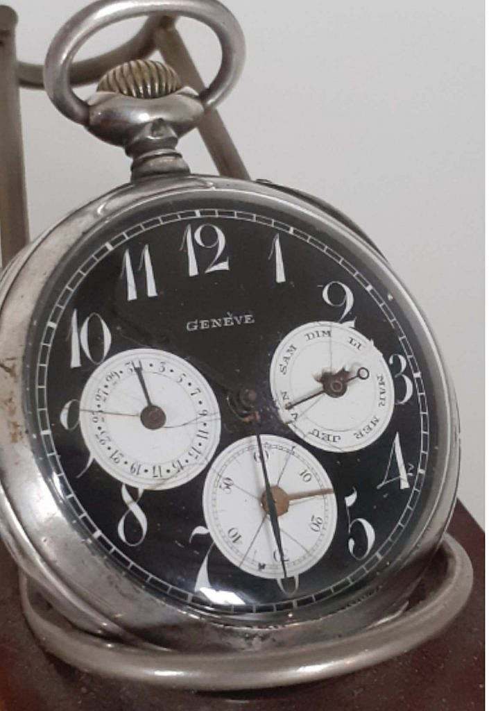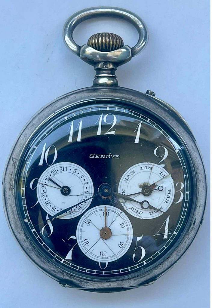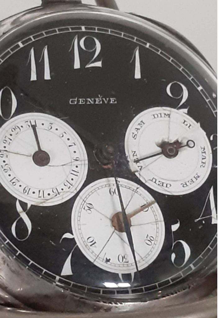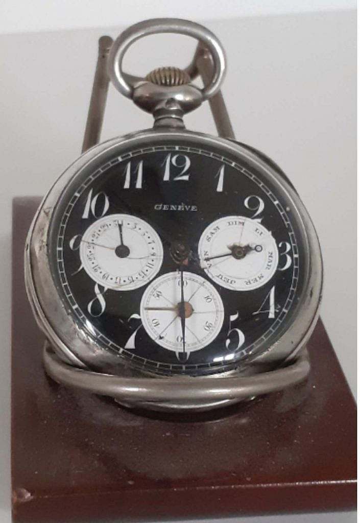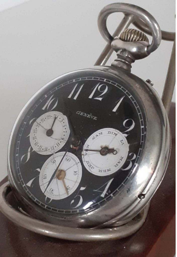 Inusual reloj suizo de la marca Genève dotado de calendario del día del mes y del día de la semana sobre esfera de esmalte negro  y subesferas en esmalte blanco sobre cobre convexo  , denominado en argot relojero oso panda.