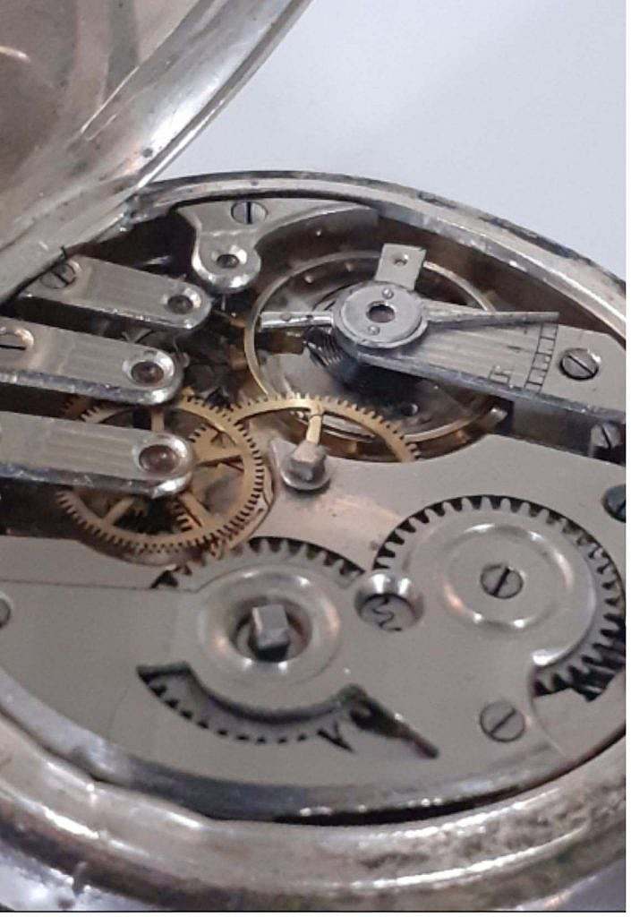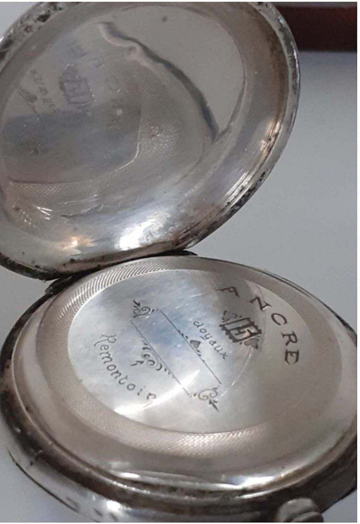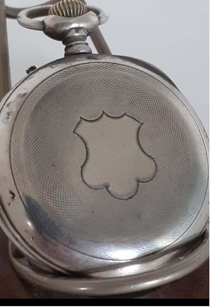 La caja es en plata de ley con el colgante la anilla de suspensión y la corona ranurada a las XII en el que se ha dispuesto en la carrura el pulsador del cambio horario a las XIII horas. En su tapa posterior se ha decorado a rombos concéntricos apretados y en su centro se ha dispuesto de un escudo liso para grabar las iniciales de su propietario. Las agujas son en latón negro.
