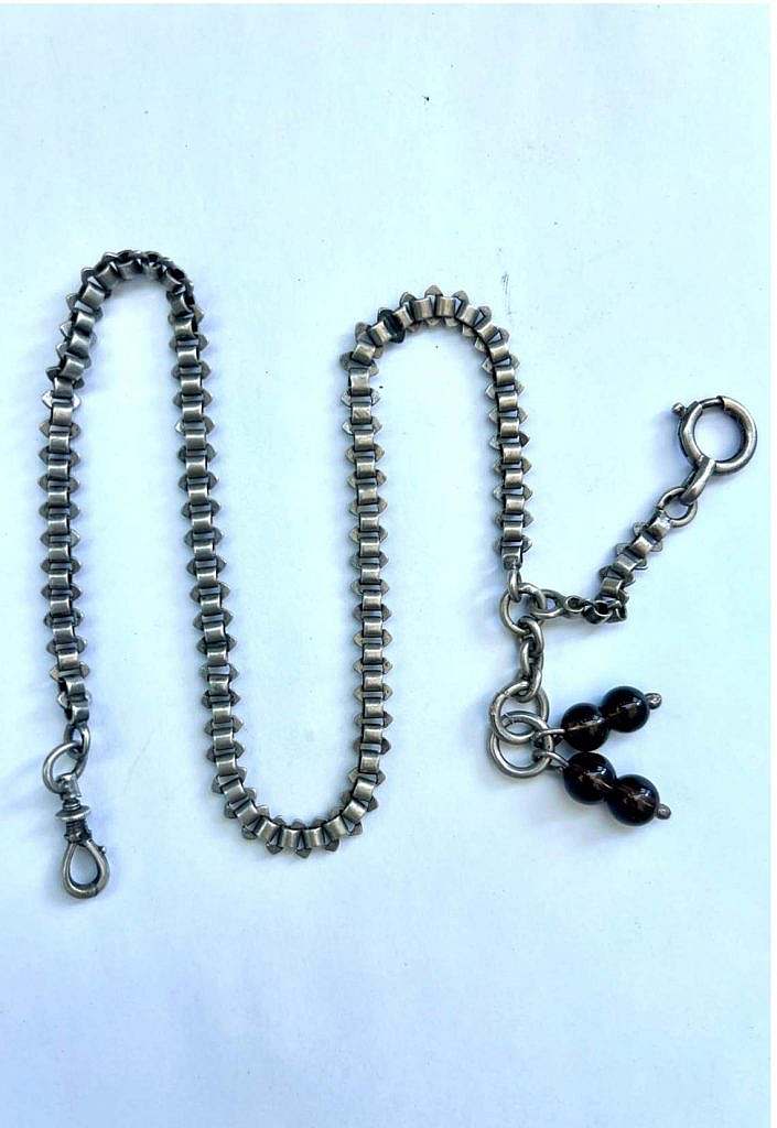 Leontina suiza formada por una pequeña cadena de muy inusuales eslabones, la cual se remata en un extremo en un gancho provisto de cierre de seguridad patentado a rosca para el reloj y de otro para el cierre y ensamblaje con el chaleco. El objeto de estas leontinas era: 1º Evitar que se cayera el reloj al suelo cuando se visualizaba la hora; 2º Evitar la pérdida del reloj; 3º Decorar el chaleco y vestimenta, dando más realce al caballero. No todo el mundo podía lucir una cadena, pues era sinónimo de poseer reloj, y el reloj en el año 1900 estaba asociado a la clase social alta. En este caso, además dispone de unas piedras redondas como si de un amuleto se tratase.