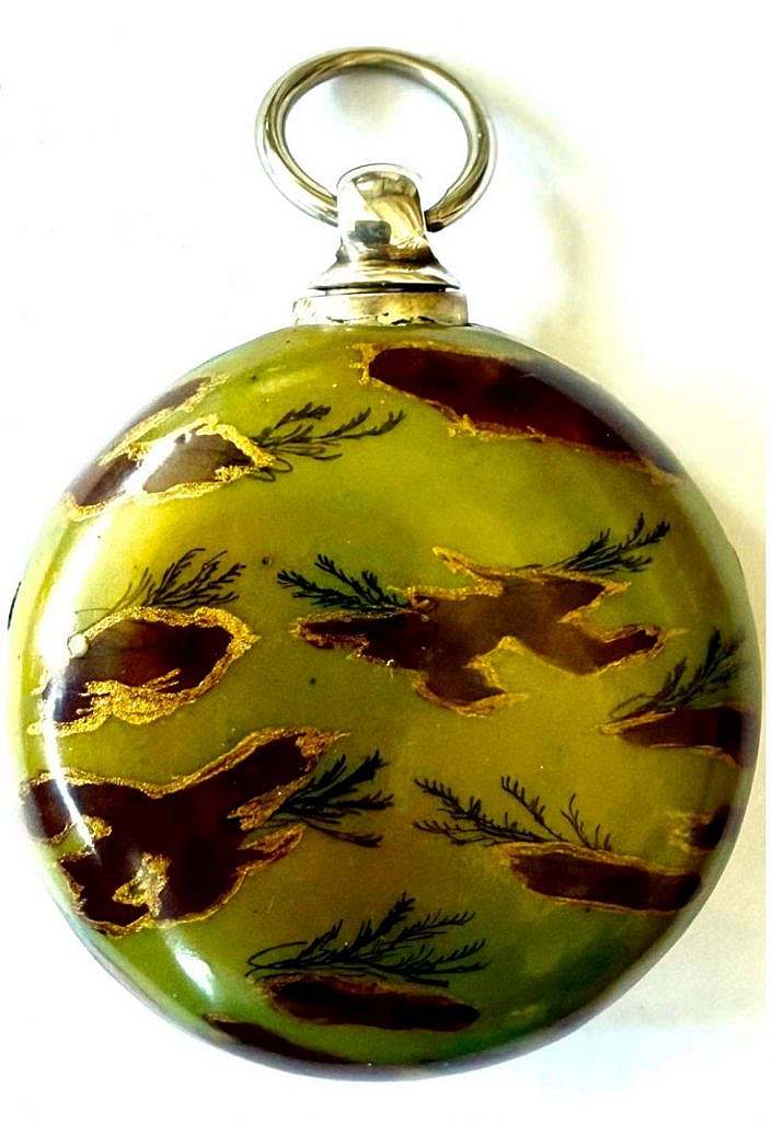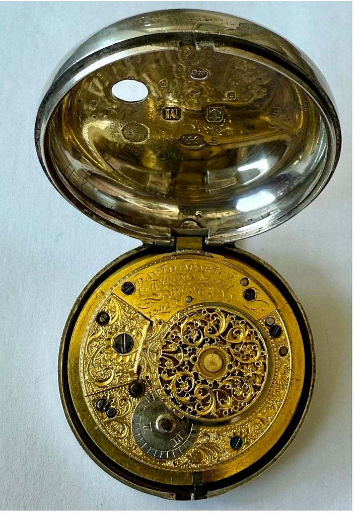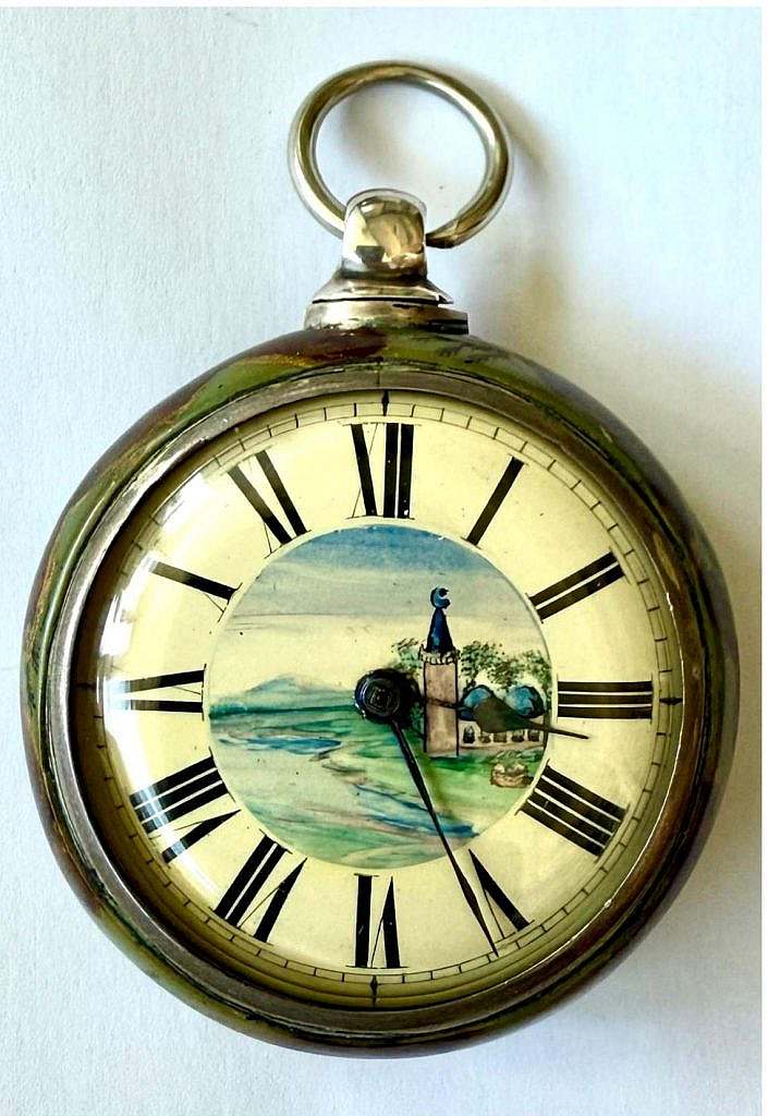 Muy inusual reloj catalino construido en 1.784 por el Maestro Relojero David Morice, Fenchurch Street de Londres. Dispone de número de serie 1.362. Reloj de doble caja en tortuga y plata de ley para el mercado turco. En el centro de su esfera se ha esmaltado una mezquita coronada por una media luna rodeada de montañas, ríos, árboles en profusión de esmaltes. La esfera es de esmalte blanco sobre cobre convexo con numeración romana en esmalte negro. Las agujas son en latón azul cobalto de estilo Pica de Látigo. La primera caja está trabajada en concha de tortuga de Carey de un intenso color verde decorada también con distintos motivos vegetales y formas irregulares las cuales han sido perimétricas en oro sobre la propia concha. La segunda caja es en plata de ley con el colgante de la anilla de suspensión a las XII. El sistema de cuerda es a llave por la parte posterior de la segunda caja. Las agujas se cambian también a llave a través de la propia esfera por el eje central de las mismas agujas.