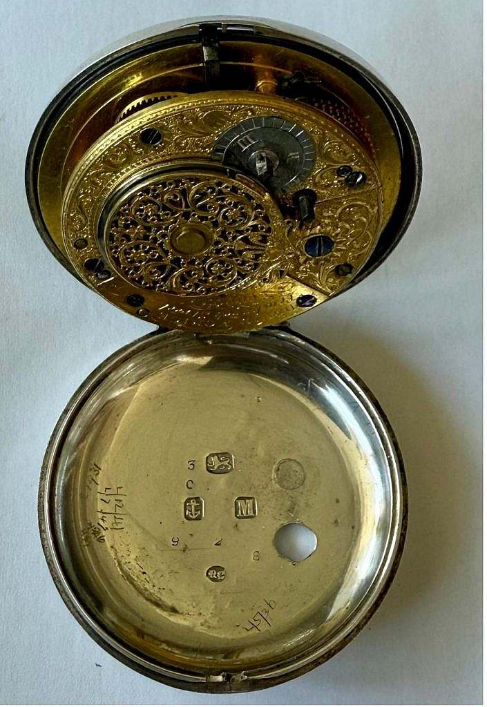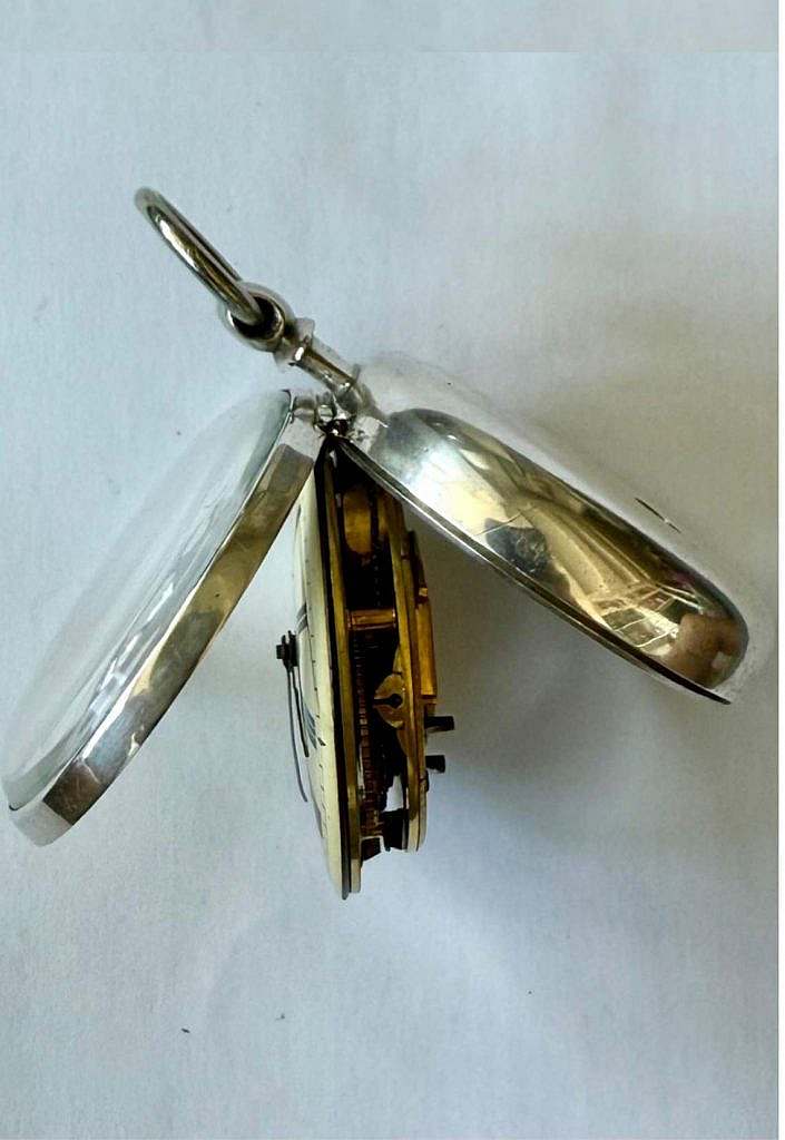 CALIBRE DEL RELOJ: El calibre de este reloj es redondo catalino a pletina completa con puente muy trabajado a la vista con elegante galluzo a motivos vegetales y florales. Los relojes de bolsillo abarcan una amplia gama de calibres, desde los más antiguos como el catalino el semicatalino a los básicos como el calibre Roskopf, hasta los más avanzados como el calibre tourbillon. Cada uno de estos calibres refleja diferentes enfoques para la medición del tiempo, adaptados a las necesidades tecnológicas, económicas y sociales de su época.En relojería, el término calibre hace referencia al diseño o tipo de movimiento interno de un reloj, incluidas las dimensiones, disposición y componentes del mecanismo. En el caso de los relojes de bolsillo, hubo una amplia variedad de calibres desarrollados a lo largo de los siglos XIX y principios del XX, adaptados a distintas necesidades y estilos. TIPO DE ESCAPE DEL RELOJ: ESCAPE DE RELOJ DE BOLSILLO CATALINO:El reloj de escape catalino es un tipo de reloj de bolsillo antiguo, caracterizado por su mecanismo de escape y su diseño de doble caja, también conocido como pair case. Este diseño fue popular entre los siglos XVII y XVIII, especialmente en Europa. Características principales: 1-Escape catalino (verge escapement): Utiliza un mecanismo de escape llamado “de rueda de encuentro” o “catalino” (verge escapement), uno de los primeros sistemas de escape desarrollados para relojes mecánicos. Este escape permite la transmisión de energía desde el tren de engranajes al volante oscilante, regulando el movimiento del reloj. Es menos preciso que los escapes posteriores, como el de áncora, pero fue revolucionario en su época. 2- Doble caja (pair case): Los relojes catalinos suelen tener una caja doble: una interna que contiene el mecanismo y una externa, desmontable, que protege el reloj de golpes, polvo y suciedad. Estas cajas externas suelen ser de plata, oro u otros metales preciosos, a menudo grabadas o decoradas. 3- Diseño histórico: Son piezas voluminosas y pesadas, diseñadas más como símbolos de estatus que como herramientas prácticas. La esfera del reloj puede estar decorada y cuenta con agujas que marcan las horas y minutos (a veces, los segundos no estaban presentes). 4-Importancia histórica: El escape catalino fue un precursor en la evolución de los mecanismos de relojería, y aunque su precisión es limitada, su diseño marcó el inicio de la relojería portátil. Los relojes de escape catalino son ahora valiosas piezas de colección, apreciadas por su historia y artesanía. En resumen, los relojes de escape catalino son artefactos históricos que representan los comienzos de la relojería mecánica portátil, con un diseño funcional y estéticamente distintivo.TIPO DE VOLANTE DEL RELOJ:VOLANTE ANULAR. El volante anular en relojería es un tipo de volante utilizado en los mecanismos de relojes mecánicos, caracterizado por su forma de anillo completo sin cortes. Este diseño es simple y resistente, pero no ofrece compensación térmica, por lo que era común en relojes menos avanzados o anteriores al desarrollo de los volantes bimetálicos. Su función principal es regular el movimiento del mecanismo mediante oscilaciones precisas, y su masa uniforme asegura un equilibrio básico para la marcha del reloj. El volante en relojería es una de las piezas clave del mecanismo de un reloj mecánico. Es un pequeño disco o rueda que oscila de un lado a otro, y junto con el espiral (un pequeño resorte), regula el ritmo al que el reloj marca el tiempo. Esta oscilación controlada asegura que el escape, que libera la energía del muelle de manera regular, lo haga de forma precisa. El volante funciona como el «corazón» del reloj, y su movimiento oscilante es lo que determina la frecuencia del tic-tac, es decir, la medición del tiempo en intervalos exactos. Si el volante se mueve con precisión, el reloj será más exacto. HISTORIA DEL PAÍS EN EL QUE SE CONSTRUYÓ ESTE RELOJ: RELOJERÍA INGLESA “La relojería ha tenido también otro de sus máximos exponentes, y por muy largo plazo, en Inglaterra. La estabilidad política conseguida por esta nación tras el paréntesis de la república de Cronwell, y su poderío marítimo y económico, ha permitido que sus mejores talentos se dedicasen con tesón y continuidad a esta actividad. Las semblanzas de Thomas Tompion, George Graham, Harrison, John Arnold, Earnshaw, Ellicott, Dent, requerirían un espacio desproporcionado al volumen de este libro: todos están suficientemente tratados en los libros, siendo cada vez más minuciosos los estudios sobre aspectos parciales de sus obras. Desde la aplicación del péndulo, que Fromantel inició en Londres a raíz del invento Huygens, el prototipo de reloj inglés permanece casi invariable. El conservadurismo propio de este país consiguió mantener el sistema de caracol tanto en relojería como en la portátil, hasta casi finales del siglo XX. Notables son sus relojes de carillón, numerosos los modelos de “taberna” y señoriales los de caja alta, para los que trabajaron los calificados ebanistas locales. El tipo de reloj inglés ha sido copiado y perpetuado hasta nuestros días en varios países, habiendo sido las fábricas alemanas las que más lo han explotado desde fines del siglo XIX”.(Texto extraído del libro “Relojes” del maestro relojero Luís Montañés; colección Diccionarios Antiqvaria).