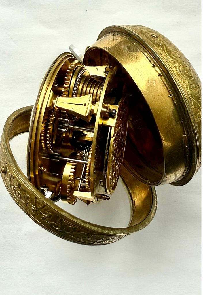 Hacia 1720, ya bajo la Regencia y los primeros compases del reinado de Luis XV, irrumpió la figura del maestro Helle, representante de una nueva sensibilidad. Sus relojes muestran una orientación más claramente artística, propia del espíritu que se alejaba del rigor majestuoso del barroco tardío para abrazar la gracia y la suavidad que definieron el gusto francés. Las cajas profusamente grabadas con figuras galantes, escenas mitológicas y roleos vegetales anunciaban el amanecer del Rococó. Al mismo tiempo, desde el punto de vista técnico, los relojes de Helle incorporaron avances significativos: la doble aguja en momentos en los que todavía no era habitual, trenes de ruedas mejorados y galluzas caladas de complejidad casi escultórica. En ellos se reconoce un equilibrio perfecto entre innovación mecánica y exquisitez artística, propio de un taller que comprendía que el tiempo que se entregaba a un miembro de la nobleza debía ser hermoso, exacto y digno.