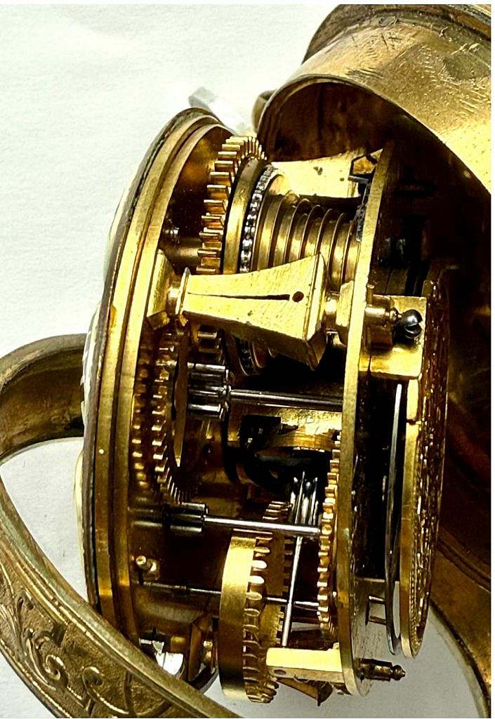 El calibre de este reloj es a pletina completa con el Galluzo cincelado a la vista y profusamente decorado con motivos vegetales y florales.