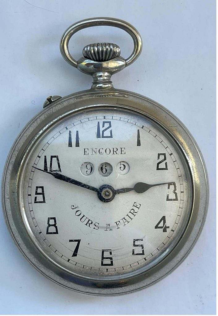 Muy inusual reloj provisto de contador de tres ventanas de hasta 999 dias, con la inscripción: “Encore, Jours a Faire”