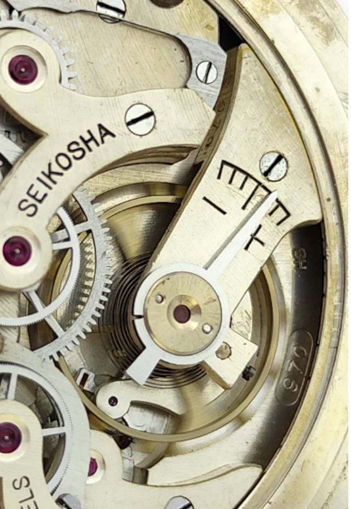 Las agujas de la esfera son en latón azul cobalto, estilo pica de látigo. La marca, SEIKOSHA, está situada en esmalte negro entre las X y las II encima del eje de las agujas.