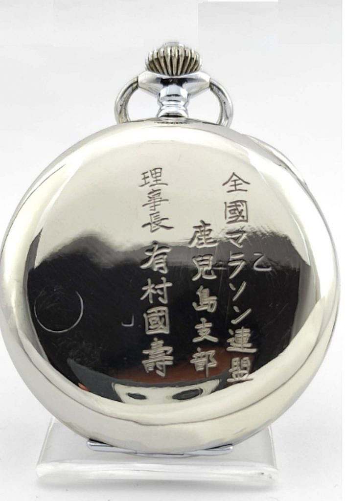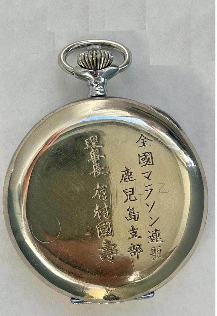 En la tapa posterior, también se ha grabado una inscripción en escritura japonesa que traducido dice: Kunihisa Arimura, Presidente de la filial de Rokujima de la Federación Nacional de Maratón del Japón.