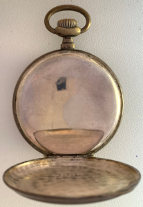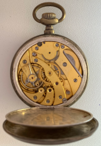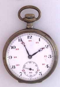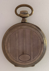 Reloj de bolsillo con indicación horaria de 24 horas con caja lepine en plata de ley a decoración lineal y con el escudo para iniciales en la tapa posterior.
