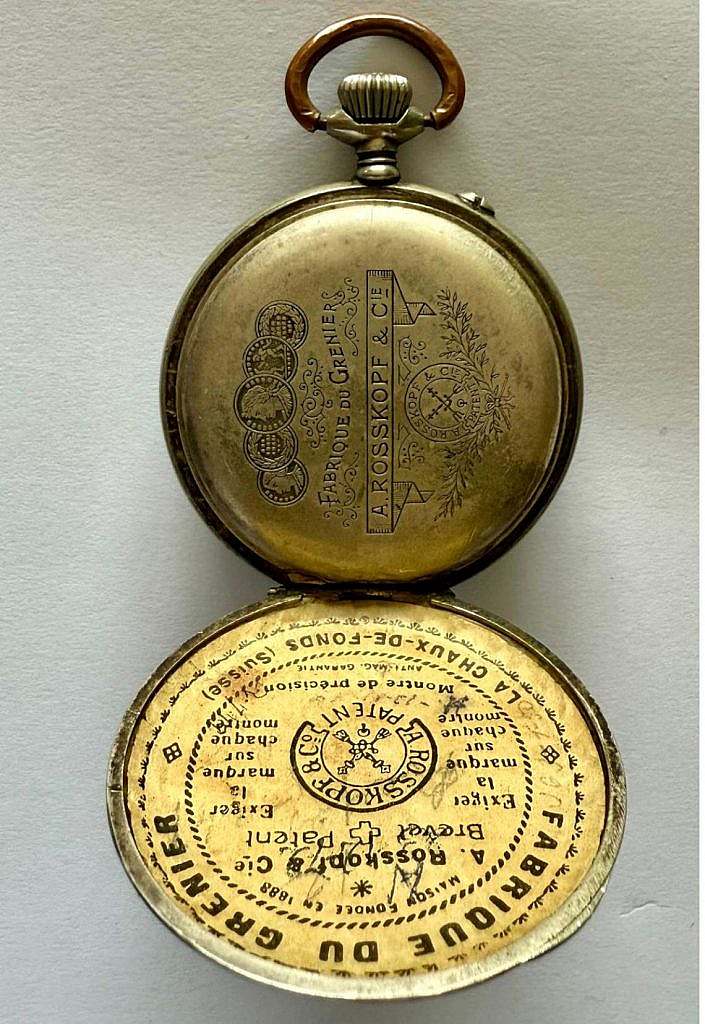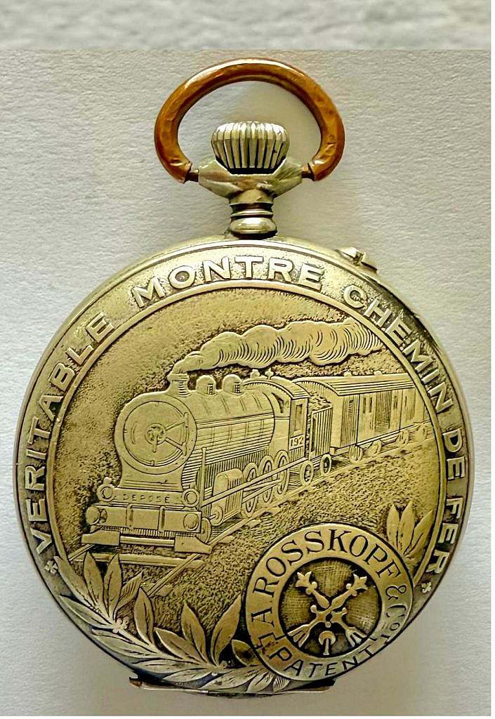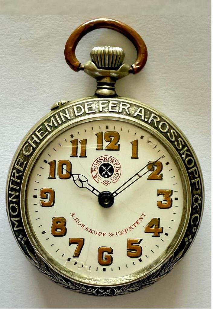 Su modelo más emblemático fue la “Montre Chemin de Fer”, un reloj de bolsillo diseñado para empleados de los ferrocarriles, con caja metálica robusta, esfera de gran legibilidad y resistencia al polvo y los golpes. Estos relojes se distinguían por los grabados en relieve con motivos ferroviarios, como locomotoras de vapor y la leyenda “Véritable Montre Chemin de Fer”, además del emblema cruzado de herramientas con la inscripción “Patent”, que garantizaba autenticidad frente a las numerosas imitaciones que inundaban el mercado. La manufactura A. Rosskopf & Cie desempeñó así un papel clave en la transición de la relojería artesanal a la producción industrial, con piezas que eran a la vez utilitarias y representativas del orgullo técnico de su época. Aunque con el tiempo fue eclipsada por firmas más sofisticadas y la irrupción del reloj de pulsera, su legado perdura en la historia de la relojería suiza como ejemplo de democratización del tiempo.