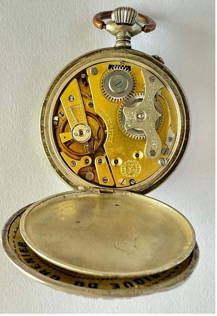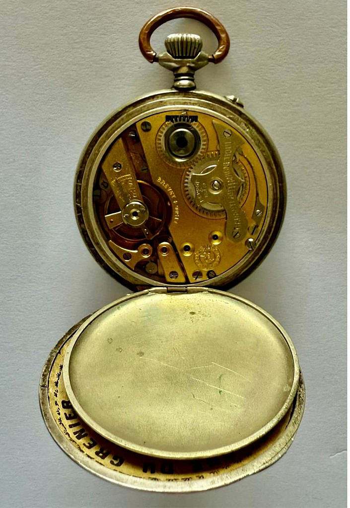 La caja trasera, profusamente decorada con dicha locomotora de vapor con vagones en relieve y la leyenda “VÉRITABLE MONTRE CHEMIN DE FER”, refuerza ese uso ferroviario. Estas imágenes no solo son decorativas, sino también una declaración de funcionalidad y marketing: servían para identificar rápidamente qué se trataba de un reloj fiable, usado y aprobado por trabajadores del tren, desde maquinistas hasta jefes de estación y que no podía fallar, los relojes de tren nunca podían fallar ya que había mucho en juego y las compañías exigían altos estándares de calidad a sus fabricantes.