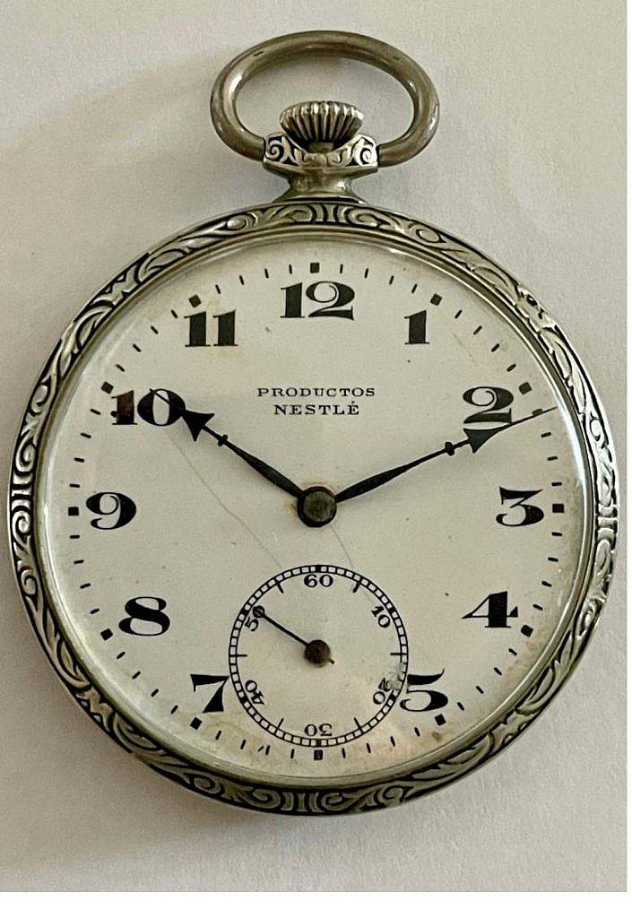 Reloj Cronómetro Halcón, fabricado expresamente a petición de la fábrica Nestlé de España en los años 20 para productos Nestlé, bajo el eslogan en su tapa posterior: “los preferidos de las personas elegantes”.