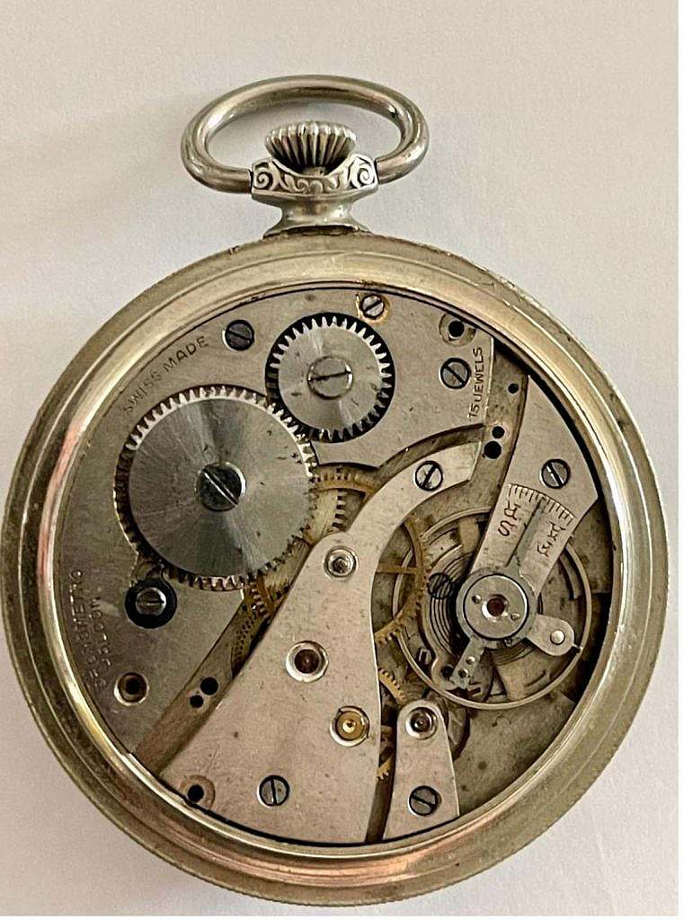 Reloj de estilo Lepine con caja en níquel y cromo dotado de colgante, anilla de suspensión y corona ranurada a las XII. La caja ha sido diseñada con carrura ranurada y biseles con motivos vegetales y florales siendo la tapa posterior lisa y en la que se ha grabado profusamente: “los preferidos de las personas elegantes” con la característica tipografía de los años 1920. La esfera es en esmalte blanco sobre cobre convexo con numeración arábiga en esmalte negro. Debajo de la indicación horaria de las 12 se ha esmaltado en negro la marca Nestlé y encima el término en letra más pequeña: Productos. Disponiendo de segundero a las VI y agujas en latón negro rematadas en triangulo.