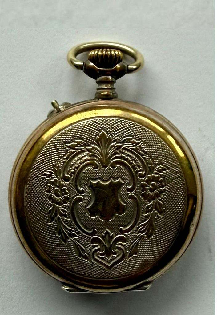 La caja, visible en la fotografía, presenta una tapa posterior ricamente decorada mediante guilloché mecánico y motivos florales en relieve, rematados por una cartela o escudo central preparada para iniciales o inscripciones. Esta ornamentación, típica de la industria relojera centroeuropea de la segunda década del siglo XX, buscaba transmitir prestancia sin incrementar los costes de fabricación, combinando prensado industrial con decoración artística inspirada en los estilos florales del periodo. La presencia de una corona tipo “cebolla”, grande y ranurada, remite a los diseños de relojes de bolsillo populares en Alemania  de 1915.