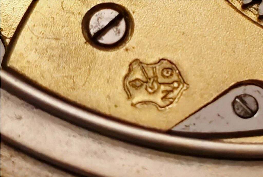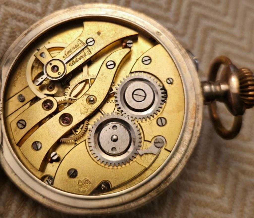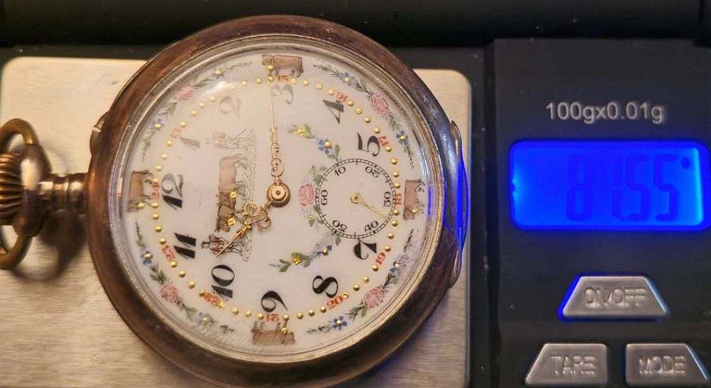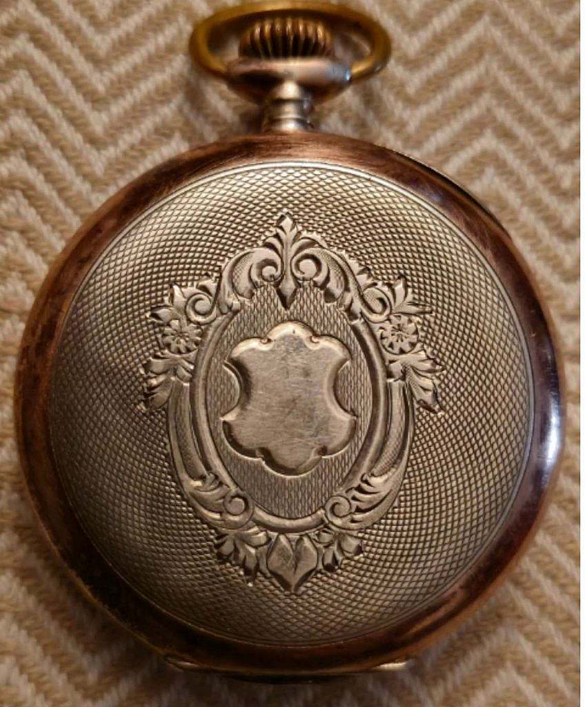 Reloj de bolsillo” Brown Swiss” mixto con caja producida en dos materiales nobles para su caja mayoritariamente en plata de ley y en oro para los biseles estando la tapa posterior cuajada con grabados Guilloché a rombos concéntricos apretados y con escudo central rodeado de motivos vegetales para grabar las iniciales del propietario. Siendo su temática el típico campestre de Suiza en su esfera. La esfera es en esmalte blanco sobre cobre convexo con numeración para las horas arábiga en esmalte negro y para los minutos también arábiga pero en esmalte rojo y situada en su perímetro siendo está más pequeña. En la esfera con profusión de esmaltes se representan desperdigadas 6 vacas de la raza que da nombre al reloj que en el caso de las centrales están acompañadas del pastor y del lechero.