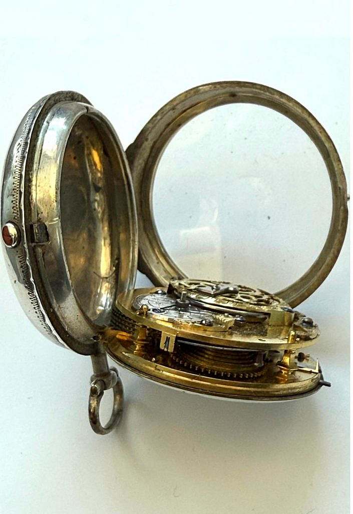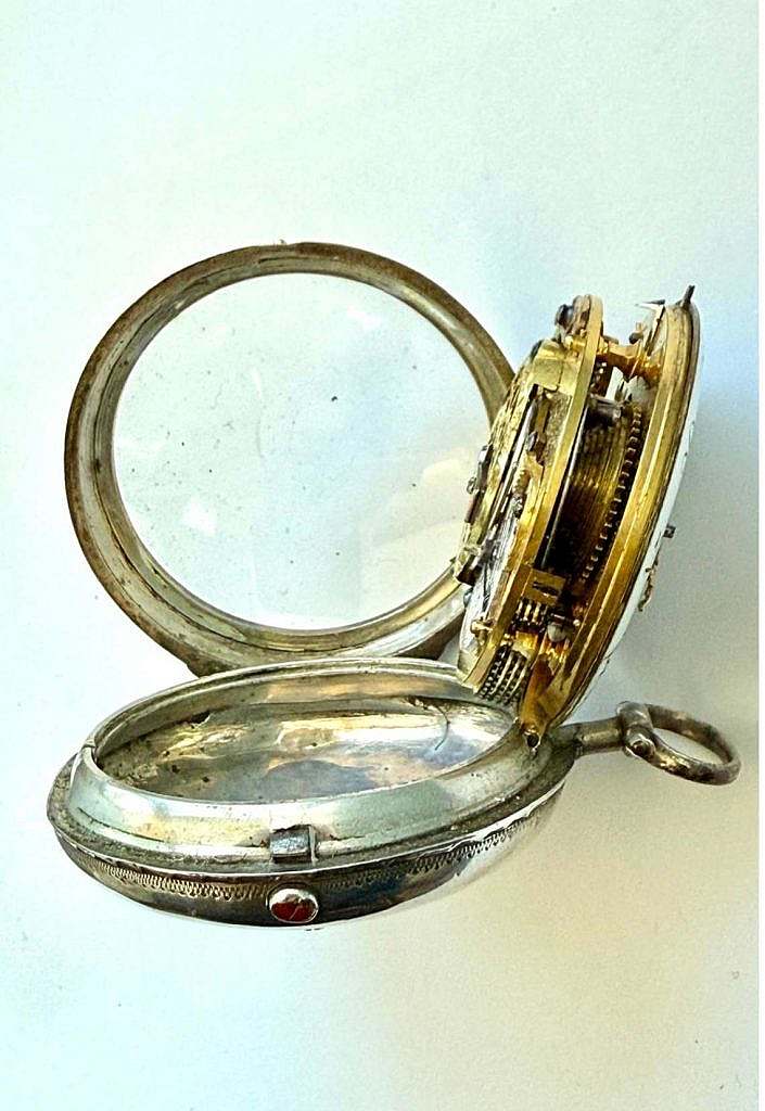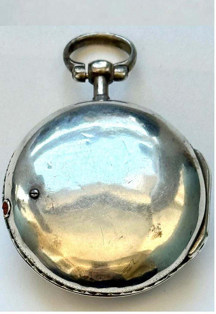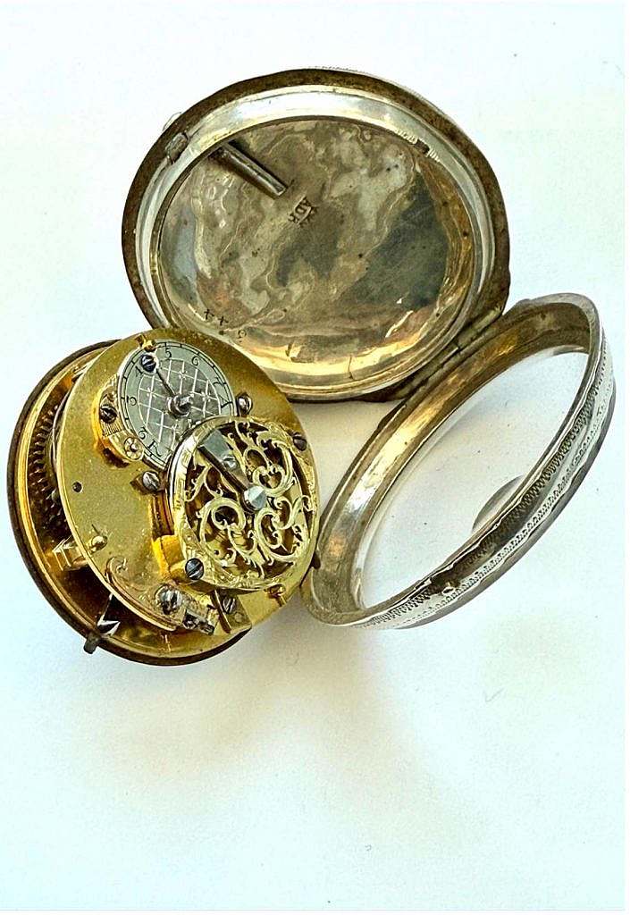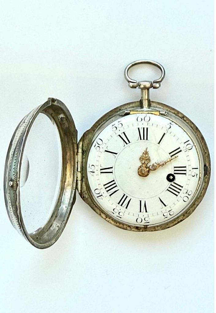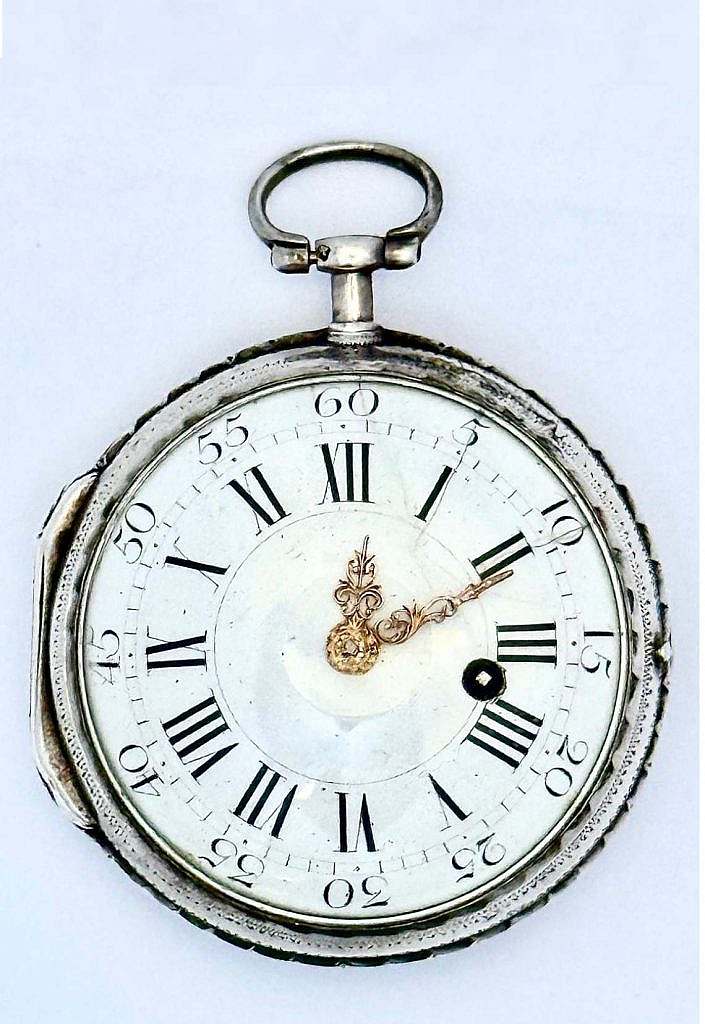 Caja lepine a plata propia del siglo XVIII, de construcción robusta y formato redondo. Presenta doble tapa con bisagra, una exterior protectora y una interior para la esfera. El estado muestra desgaste homogéneo, abolladuras y marcas de uso compatibles con su antigüedad. Anilla de suspensión fija para cadena, integrada en la segunda caja también de plata. Pulsador lateral para la apertura de la tapa, solución habitual en relojes catalinos del periodo.