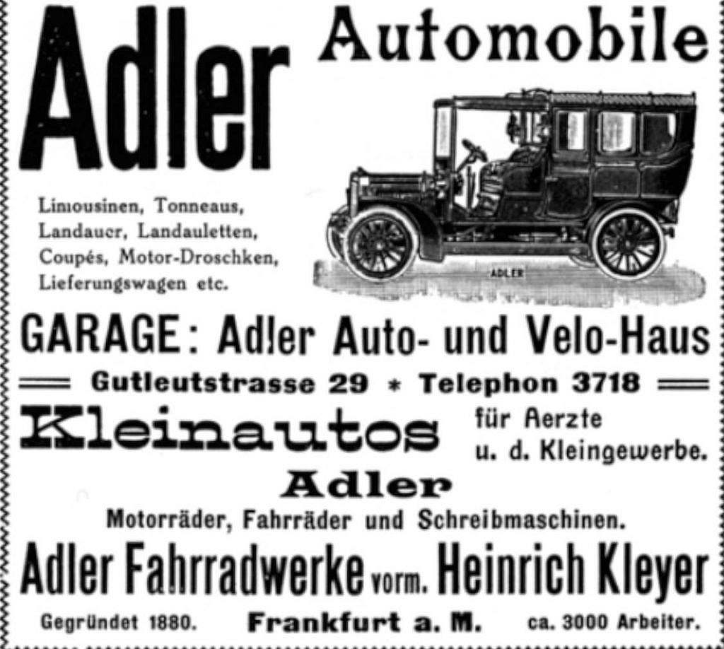 HISTORIA DE ADLER. La Marca de Coches Adler fue una marca alemana de automóviles y motocicletas, activa principalmente entre finales del siglo XIX y principios del XX. Fundada en 1886 por “Heinrich Kleyer “ en Frankfurt, la empresa originalmente producía bicicletas y máquinas de escribir antes de expandirse al sector automotriz.