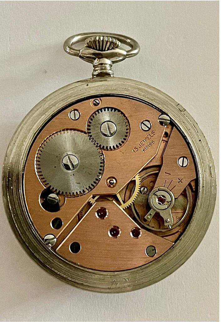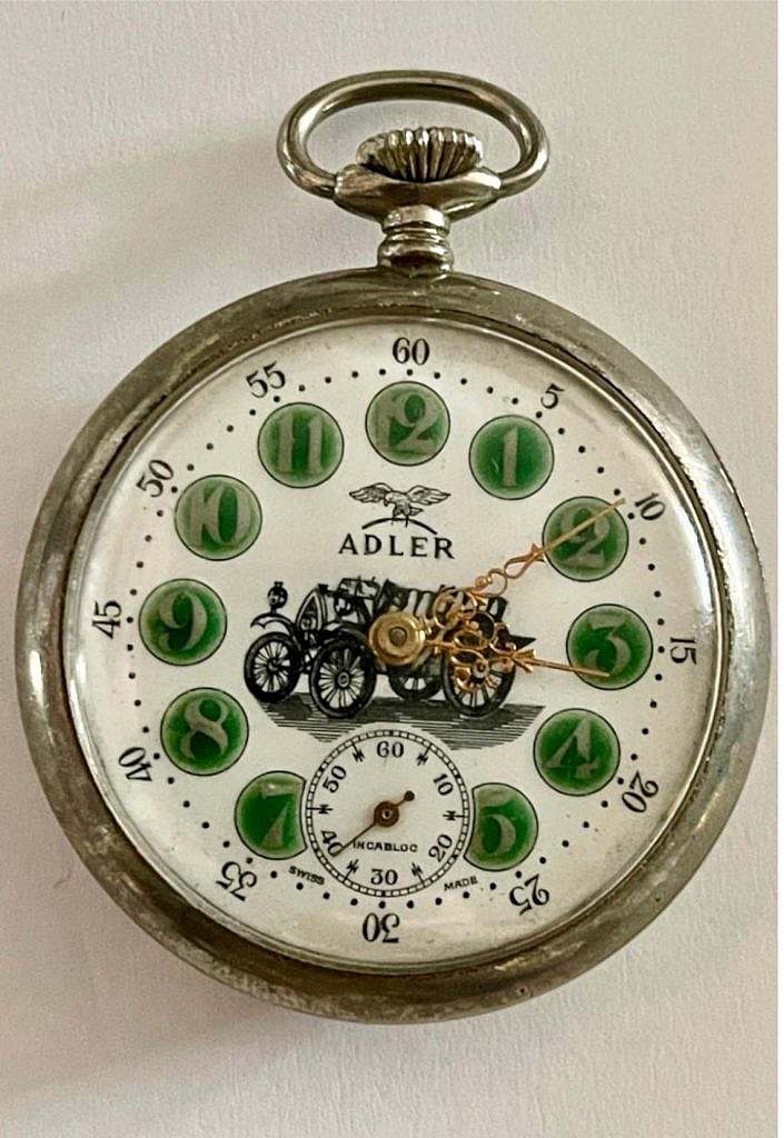 El sistema Incabloc fue inventado y desarrollado en el año 1934 siendo un gran aporte a la ciencia relojera. Sus creadores fueron los ingenieros mecánicos Georges Braunschweig y Fritz Marti quienes trabajaban en la Universal Escapements Limited en Suiza, La Chaux de Fonds. El reloj dispone de caja Lepine en níquel y cromo con el colgante la anilla de suspensión y la corona ranurada a las XII. En su esfera en esmalte blanco sobre cobre convexo la numeración horaria arábiga ha sido dispuesta en esmalte verde claro sobre cartucho en verde oscuro produciendo una gran elegancia que enaltece la esfera y en su perímetro los minutos de cinco en cinco hasta los sesenta minutos en esmalte negro y con elegante segundero a las VI. En su centro aparece el icónico coche Adler en esmalte negro y debajo de la indicación horaria de las XII su primer logotipo y marca tambien en esmalte negro. En la tapa posterior se ha repujado un Alfa Romeo de la misma época que el Adler.