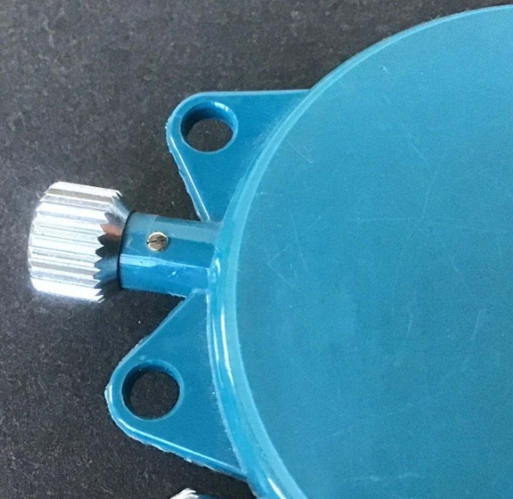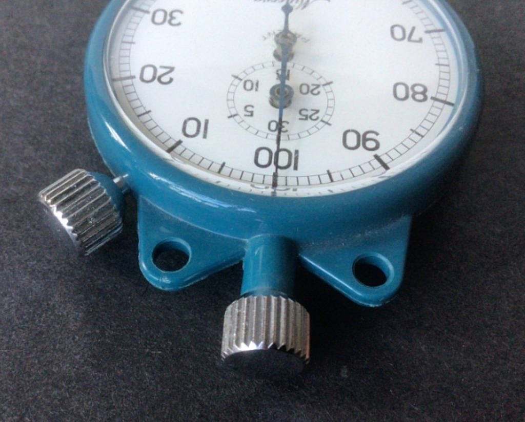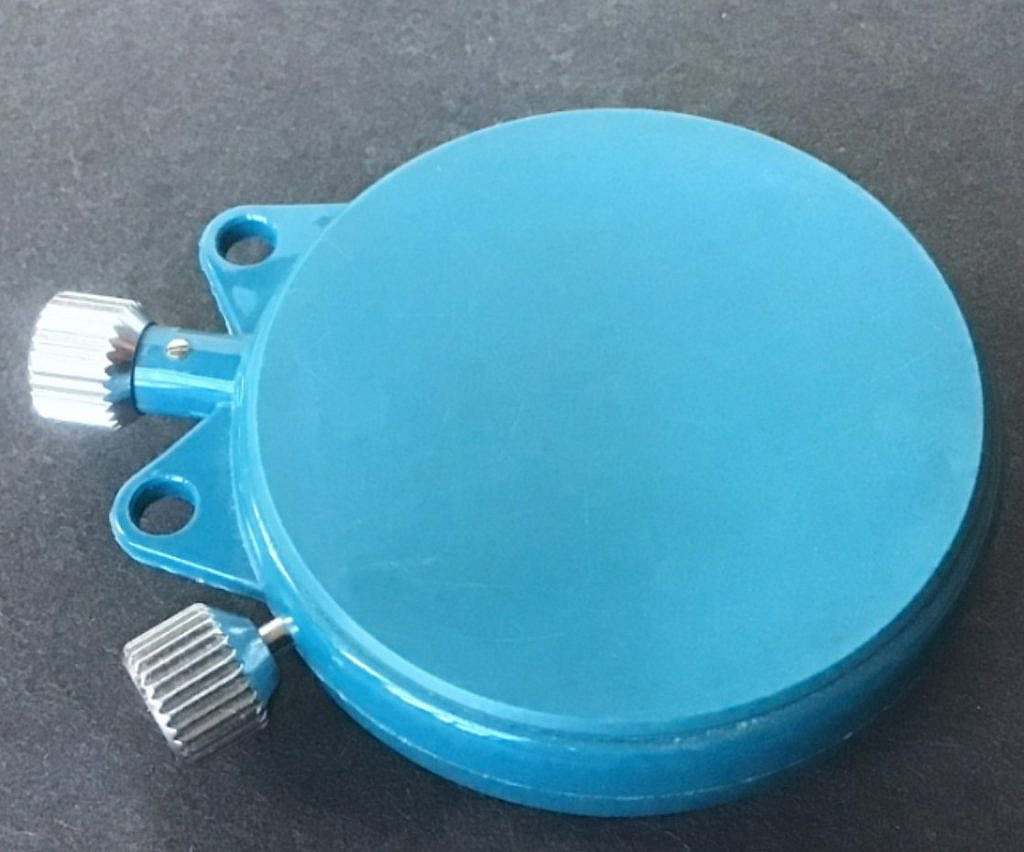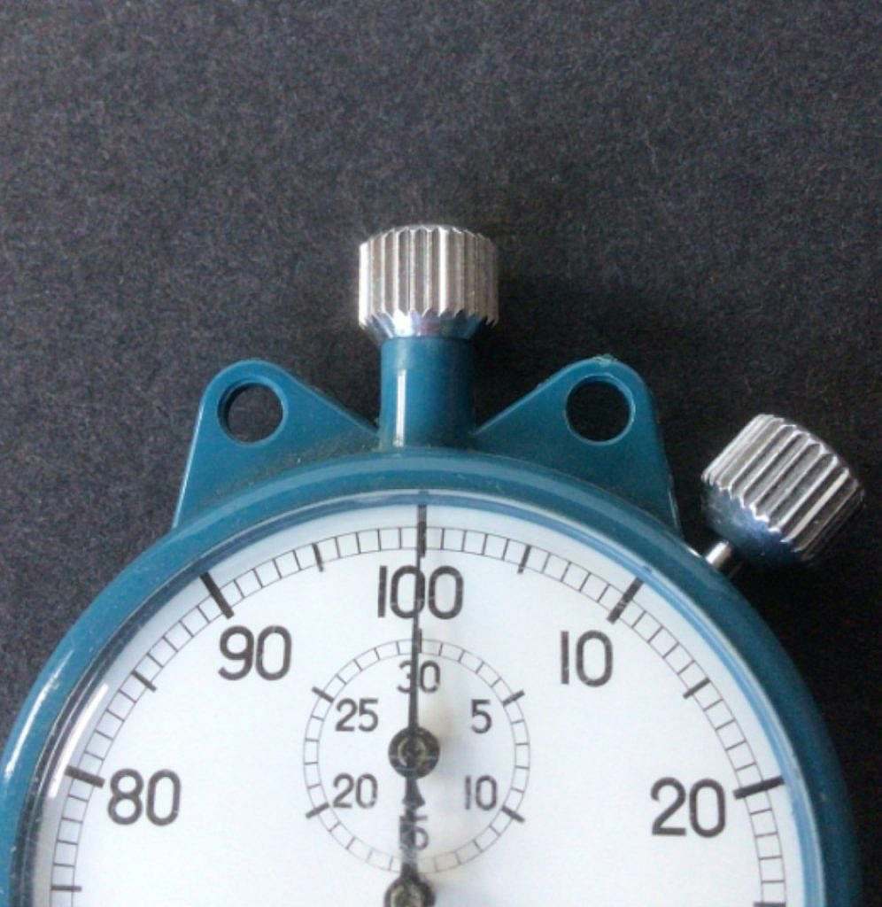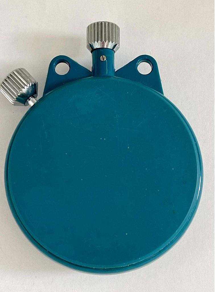 Su caja es de plástico azul de estilo lepine con el colgante y dos anillas de suspensión para cordón, así como corona ranurada a los 100. En su carrura se ha dispuesto de segunda corona ranurada para la puesta a cero del cronómetro. La esfera es en metal lacado en blanco y la numeración es arábiga disponiendo de subesfera contadora a las 100. Las dos agujas son en latón negro estilo pelo. Entre las 60 y las 40 se ha estampado de la marca Minerva y para quien se ha fabricado.