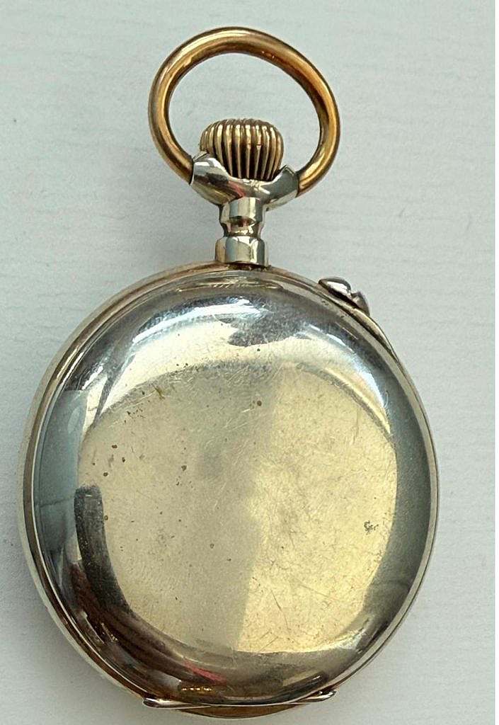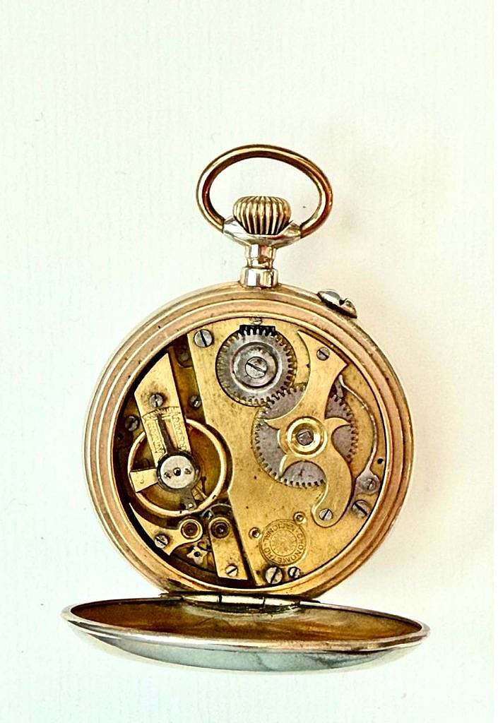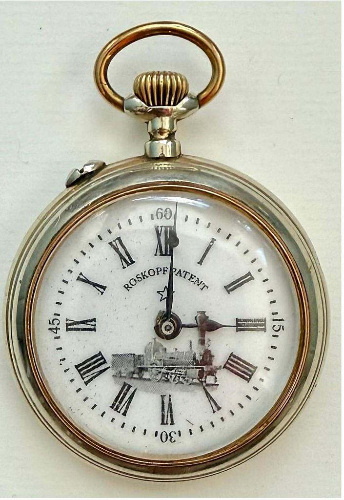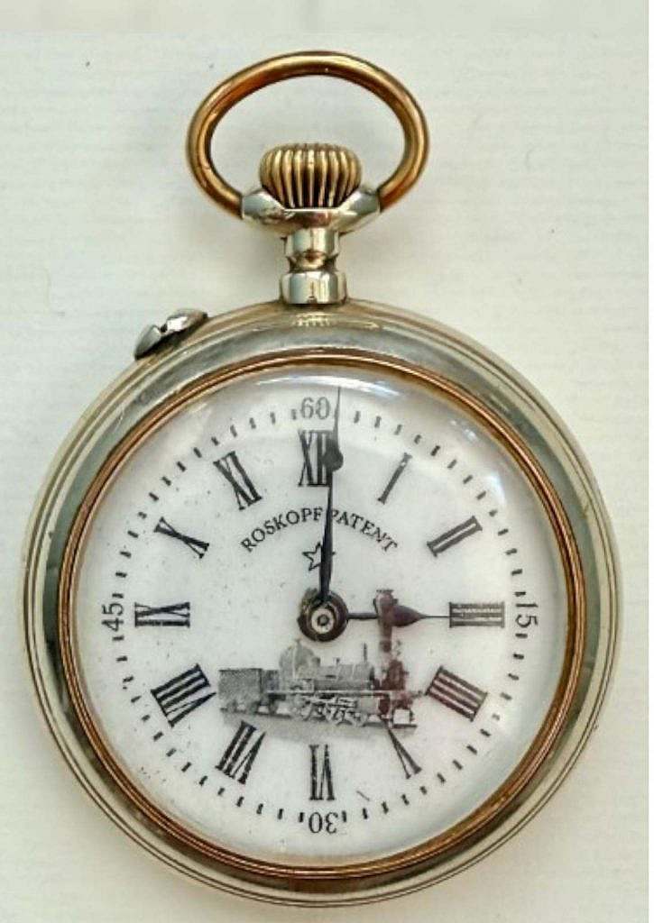 Reloj de bolsillo Cronometró Nacional Roskopf con motivo Ferroviario en su esfera.