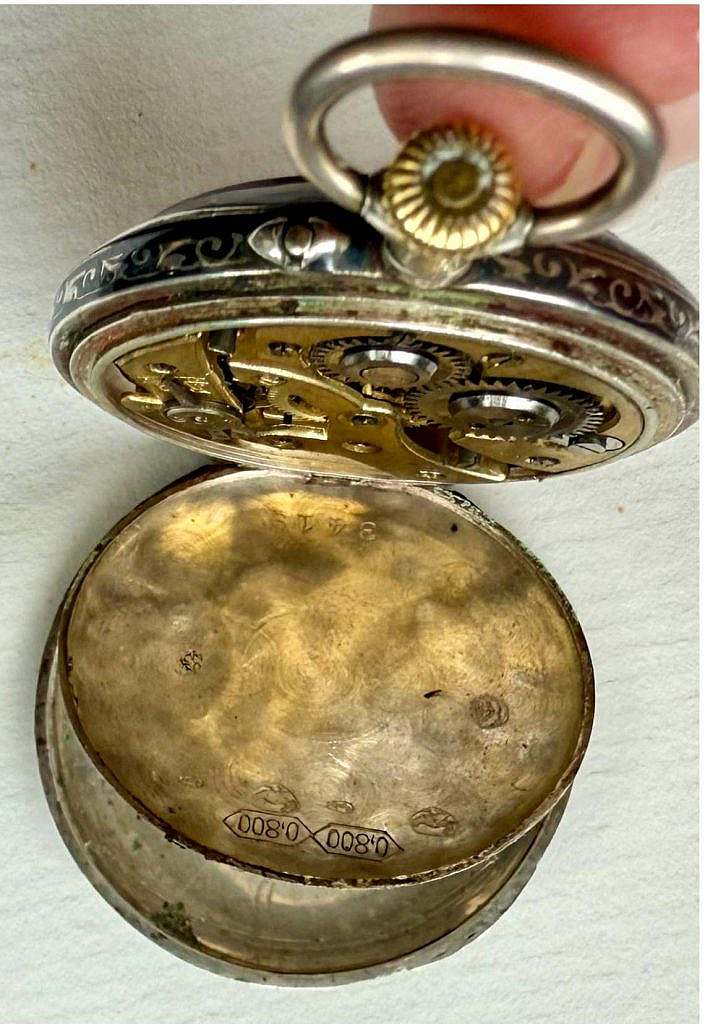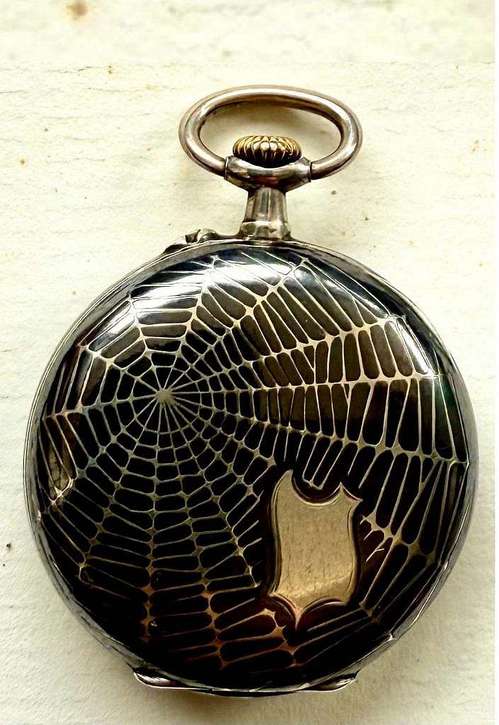 Este tipo de relojes de dama se diseñaban para una clientela que buscaba elegancia y modernidad; sin embargo, este ejemplar destaca por incorporar un motivo excepcional: una tapa posterior nielada con una gran tela de araña estilizada, ejecutada con notable precisión sobre plata de ley, procedimiento en el que se rellenan los surcos grabados con una pasta negra vitrificada. El diseño era extremadamente poco común en la relojería suiza anterior a 1910, lo que convierte a la pieza en un objeto atractivo tanto desde la perspectiva histórica como desde la del coleccionismo artístico. El pequeño escudo liso reservado en el reverso permitía grabar iniciales o dedicatorias, signo habitual de los relojes de dama destinados a grabar las iniciales de la propietaria.