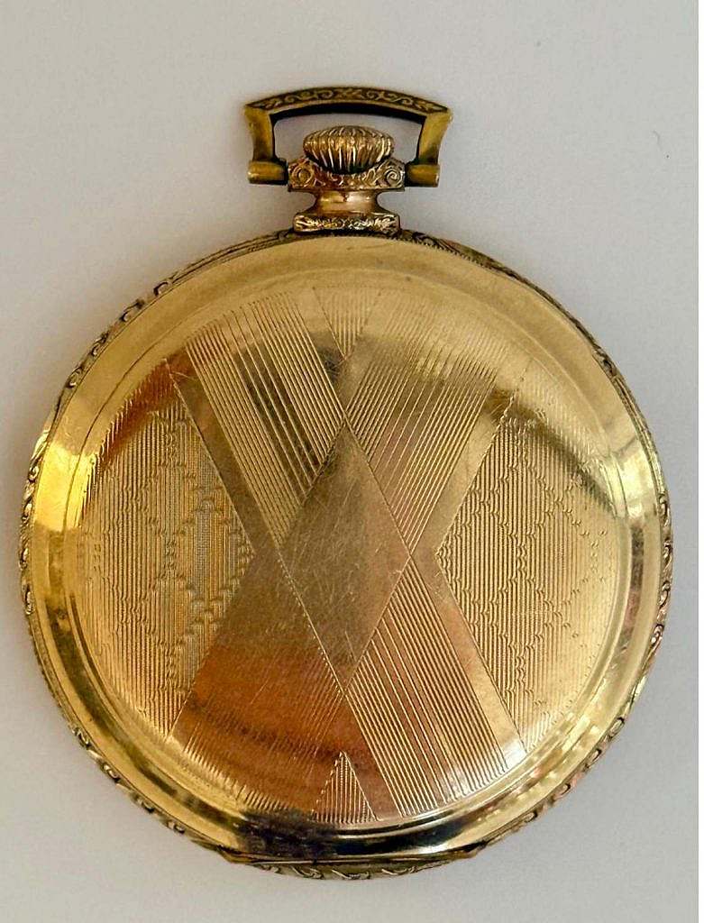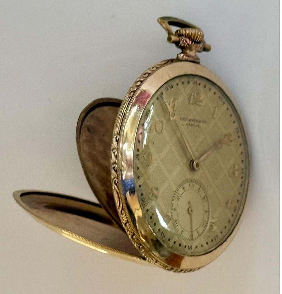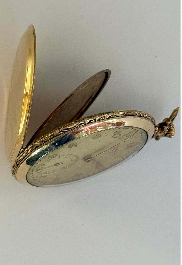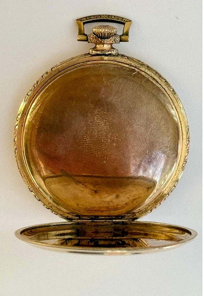 Dotado de caja lepine sobredorada con el colgante la anilla de suspensión y la corona ranurada a las XII. En el interior de la tapa posterior se ha grabado: “WALZ GOLD DOUBLE 20 MIKRON 10 JAHRE GARAN 501290”. La caja ha sido decorada al más puro estilo Art Déco a rombos profusamente grabados con motivos lineales. La esfera es dorada haciendo conjunto con el reloj y se ha cuajado a rombos concéntricos apretados siendo la numeración de la esfera arábiga en relieve y también sobredorada disponiendo de segundero a las VI. Las agujas son en latón sobredorado estilo Breguet.