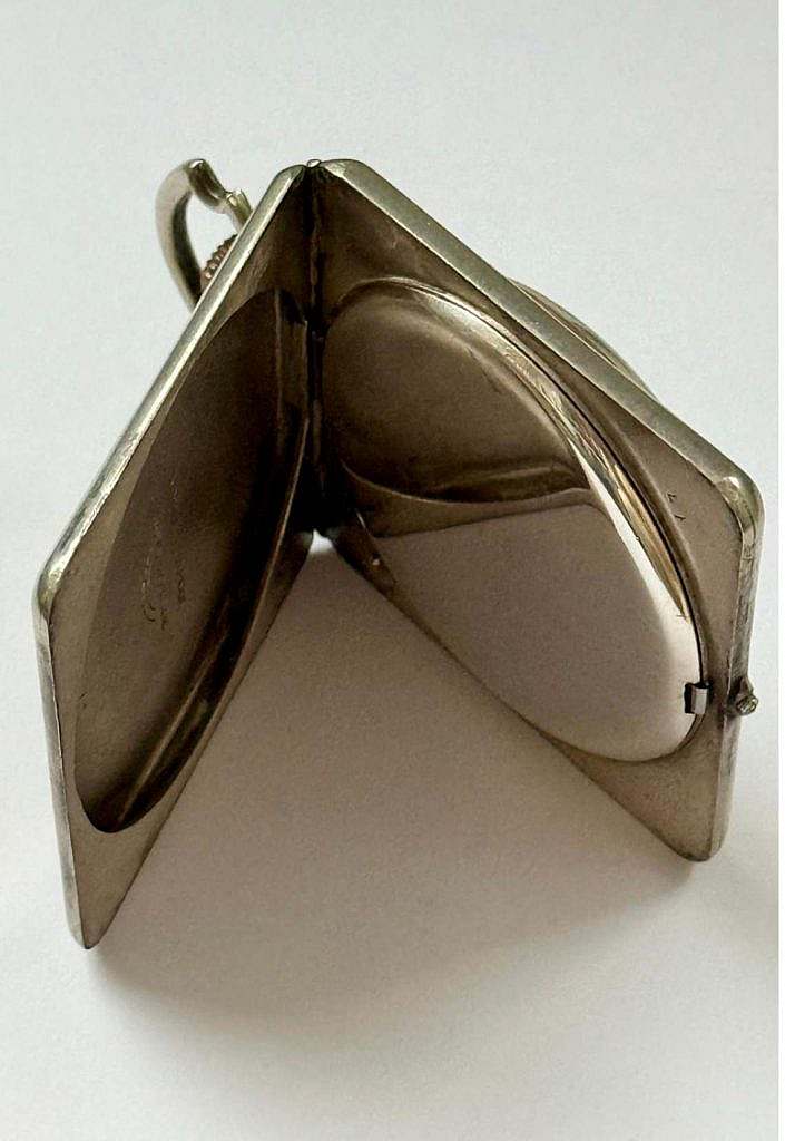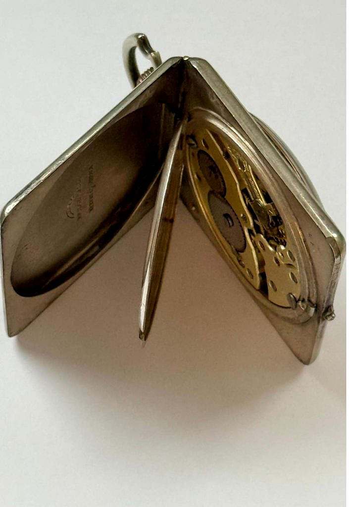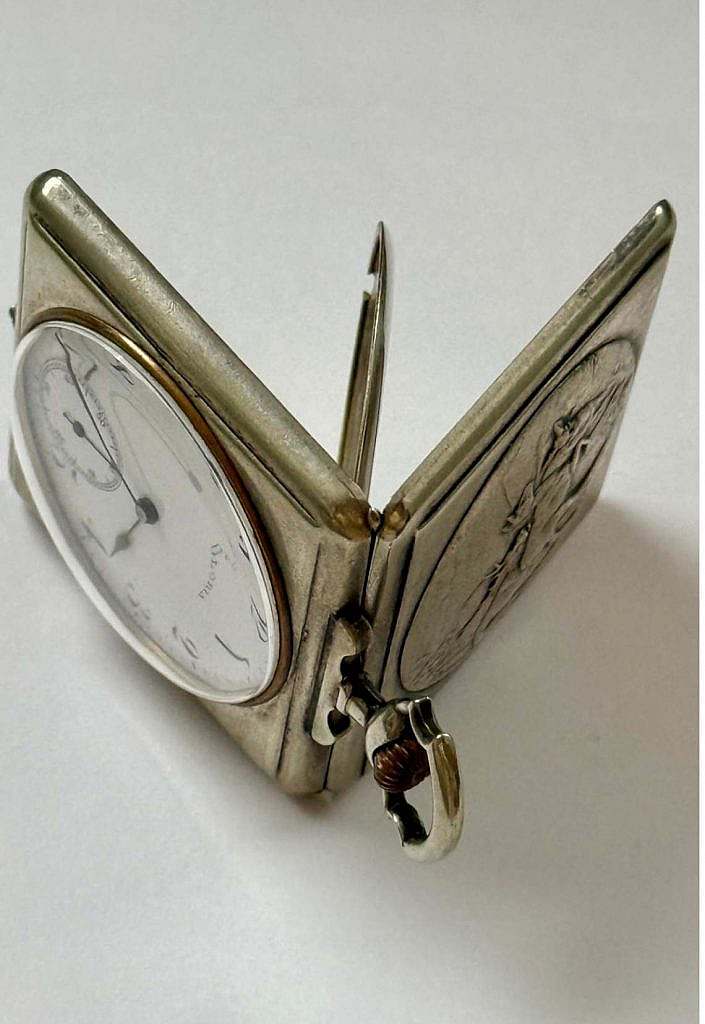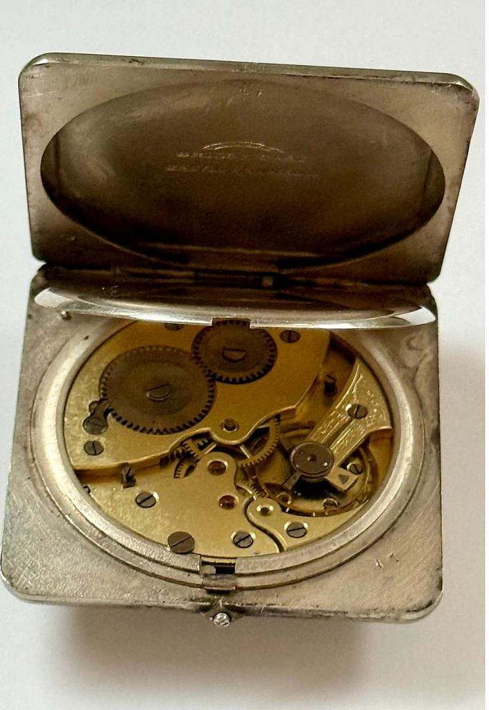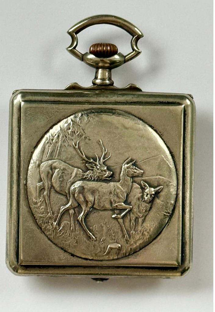 Reloj de bolsillo de inusual caja cuadrada (bridge case) con motivo cinegético de la marca Gloria, dotado de patente número 33.606.
