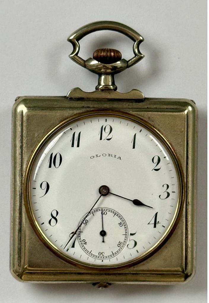 Reloj de bolsillo de la marca Gloria dotado de patente número 33.606 y de inusual caja cuadrada (bridge case) con el colgante la anilla de suspensión y la corona ranurada a las XII que permite al reloj ponerse de pie en la mesita de noche y visualizar la hora desde la cama o bien en el escritorio sin necesidad de sacarlo del bolsillo del chaleco para ver la hora convirtiendo el proceso en menos laborioso y más práctico.