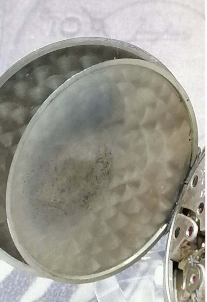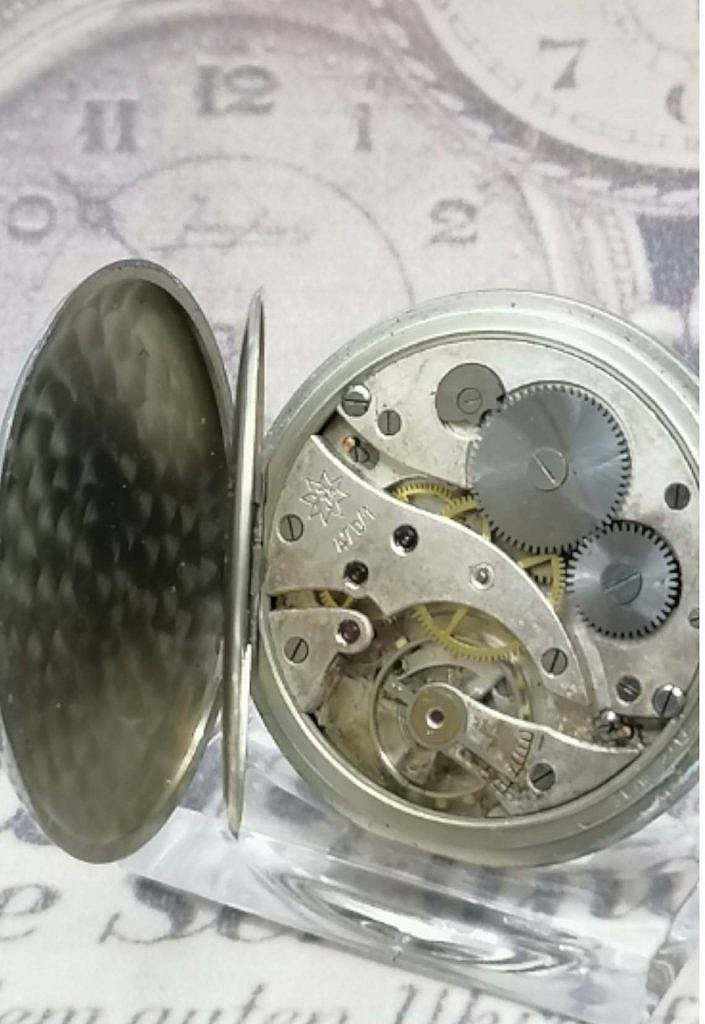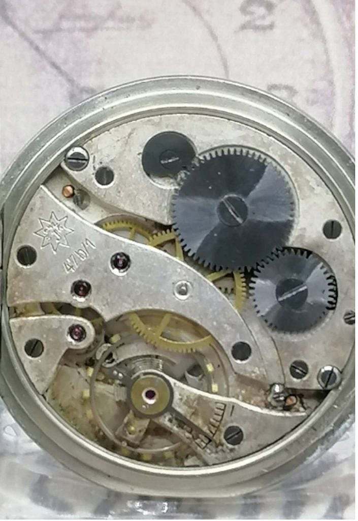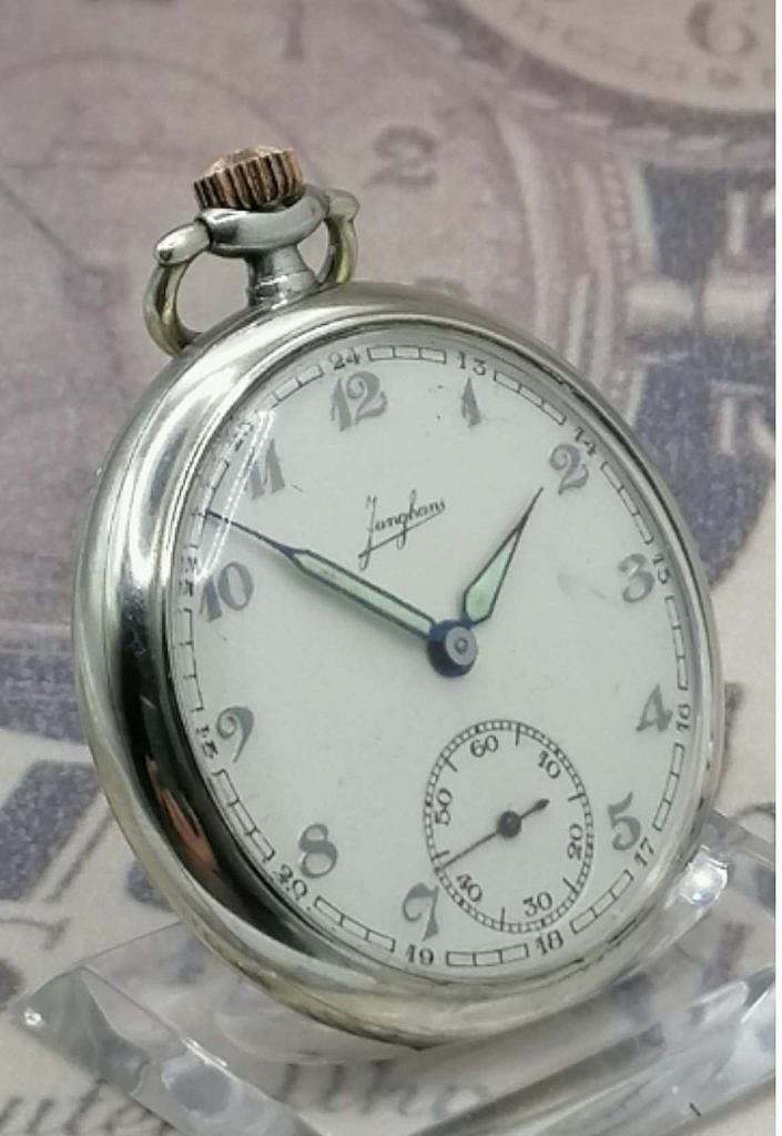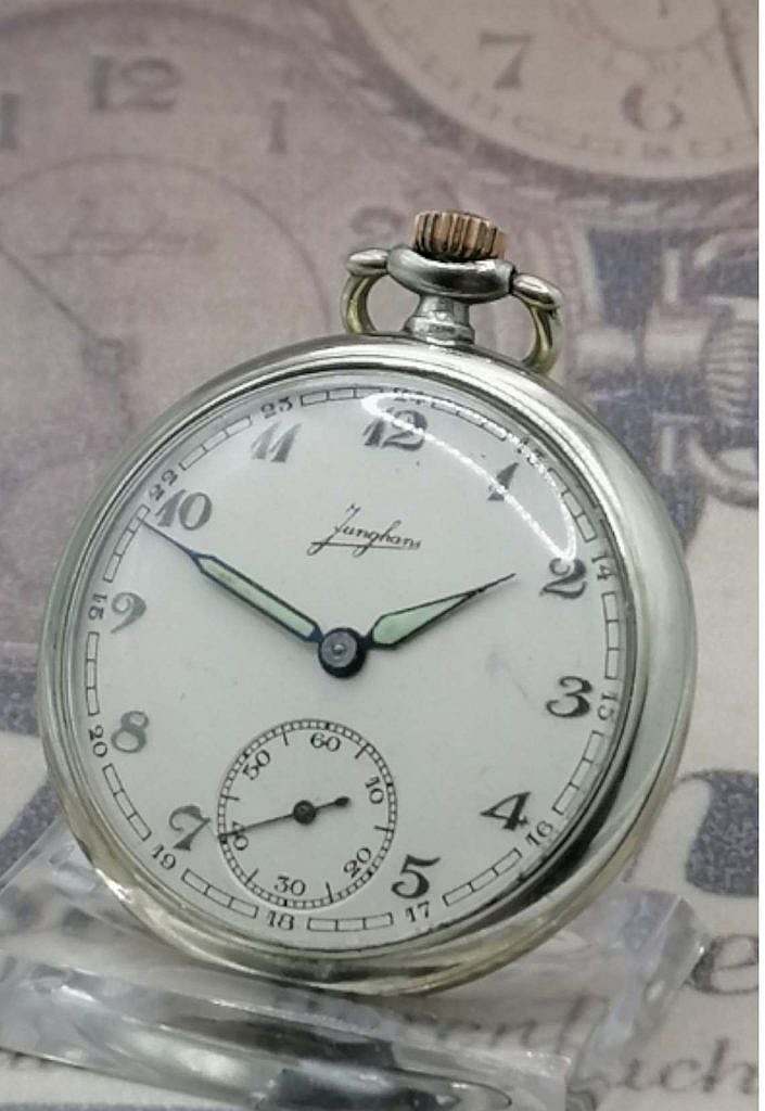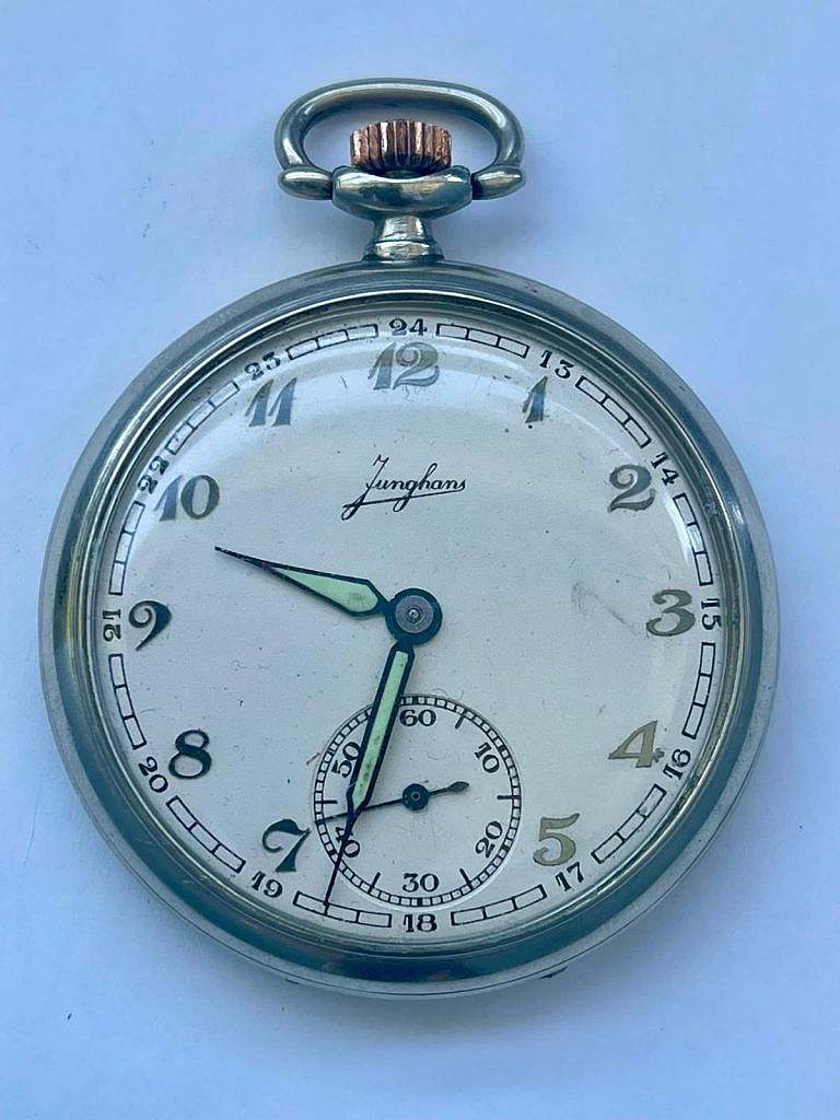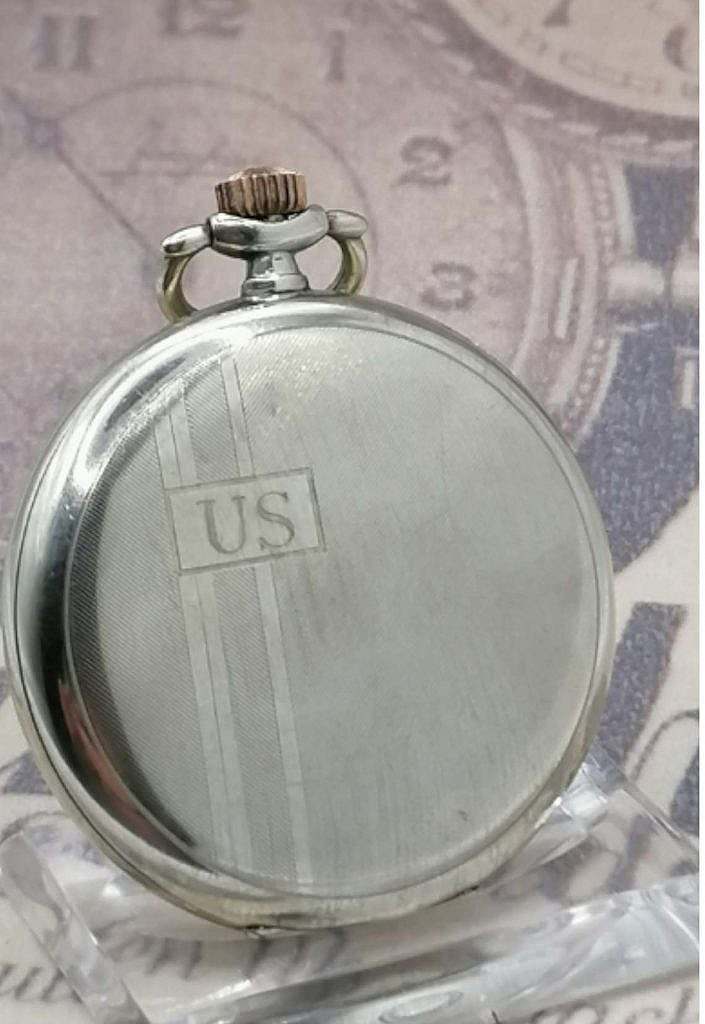 Reloj de bolsillo de la marca alemana Junghans construido en caja de níquel y cromo lisa en la que en su tapa posterior se han grabado las iniciales US. Se trata de un reloj lepine con el colgante la anilla de suspensión y la corona ranurada a las 12. La esfera es en esmalte blanco sobre cobre convexo con numeración arábiga en relieve también en níquel y cromo. La esfera dispone de segundero a las 6 y de agujas esqueleto rellenas de litio de intenso color verde.