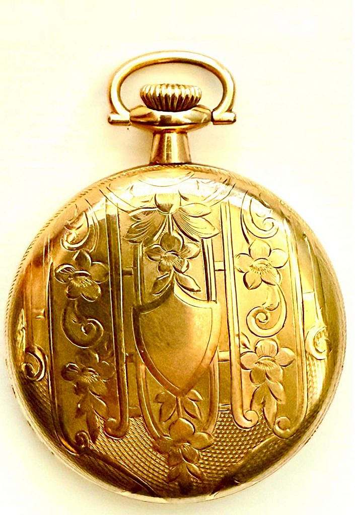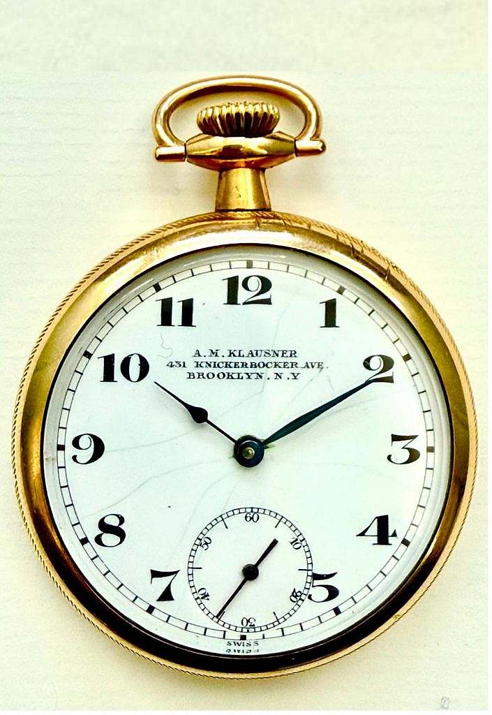 El reloj de bolsillo distribuido por A. M. Klausner en 431 Knickerbocker Avenue, Brooklyn, Nueva York, presenta una arquitectura clásica de reloj abierto con caja metálica sobredorada, cuyo reverso está ricamente grabado con motivos florales y vegetales en relieve dentro de una composición ornamental que recuerda al Art Nouveau tardío disponiendo de escudo de características; esta decoración, bien conservada, aporta a la pieza una presencia estética destacable. La esfera, en esmalte blanco o porcelana vitrificada, muestra el craquelado característico del envejecimiento natural, manteniendo sin embargo toda su integridad y legibilidad. Sobre ella se disponen números árabes en esmalte negros de trazo limpio, el segundero está a las VI en una subesfera. Las agujas de las horas y minutos son de estilo Pica de Latigo. Debajo de la indicación de las XII se ha esmaltado la inscripción comercial “A. M. KLAUSNER – 431 KNICKERBOCKER AVE. – BROOKLYN N.Y.”, signo distintivo de su distribución local en Nueva York.