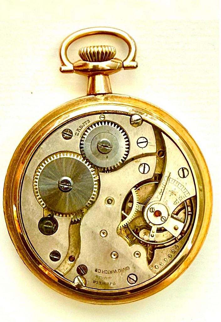 En su interior alberga un movimiento suizo de ébauche, construido en platina abierta y ajustado en dos posiciones, con la inscripción “SWISS” grabada en la base. El calibre, típico de los movimientos producidos por fabricantes como FHF, A. Schild o Cupillard durante el período de entreguerras, emplea escape de áncora suizo, volante bimetálico con tornillos periféricos y regulador indexado tradicional, también utilizados por Omega. Las ruedas del tren de engranajes, la rueda de corona y el barrilete están dispuestas de forma ordenada y muestran un acabado industrial limpio, acorde al estándar suizo destinado a exportación. Los tornillos, de cabeza pulida, y la geometría de los puentes revelan la manufactura funcional y robusta característica de las piezas suizas fabricadas para el mercado estadounidense entre 1930 y 1945. La tapa interior conserva su numeración estampada, correspondiente al fabricante de cajas, y presenta un desgaste uniforme compatible con su edad.