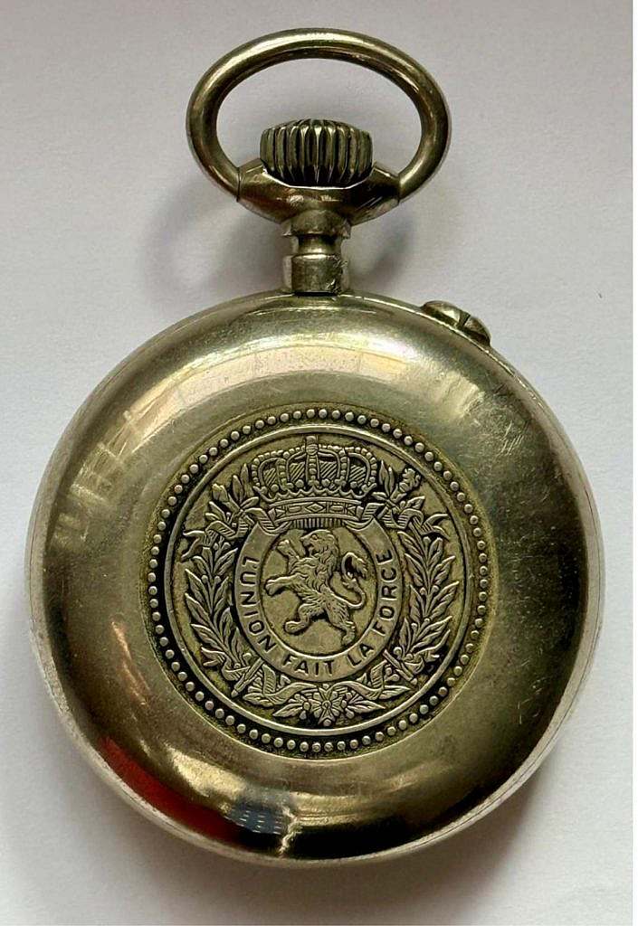 Reloj de bolsillo Belga de la marca :”Inimitable BAF” con caja lepine en níquel y cromo la cual dispone de anilla de suspensión,corona ranurada y colgante a las XII. Dispone para el sistema de cambio horario de pulsador en la carrura a las XI. La esfera es en esmalte blanco sobre cobre convexo y está dotada de indicadores hasta las 24 horas en numeración romana en esmalte negro y arabiga en esmalte rojo. Las agujas son en latón dorado estilo Luis XVI. La marca está esmaltada en rojo debajo de la indicación horaria.