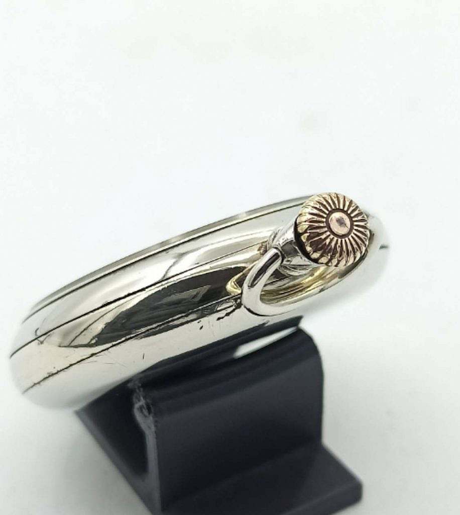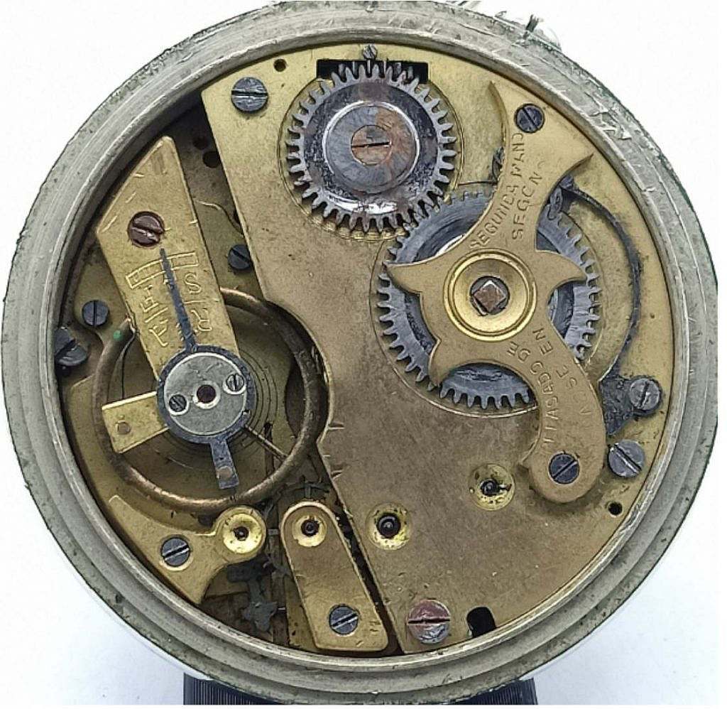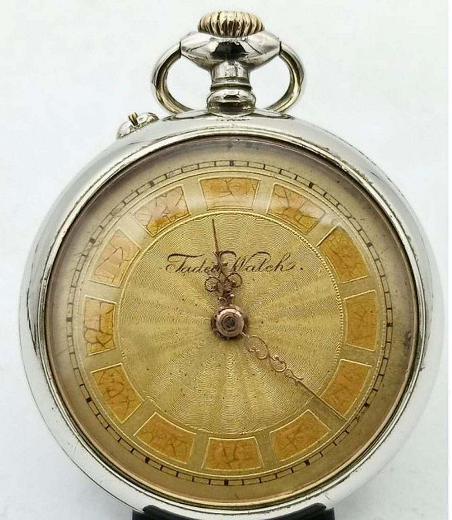 Reloj de bolsillo estilo Lepine con el colgante la anilla de suspensión y la corona ranurada a las XII. Habiendo sido repasado en segunda mano, previo a su venta en origen y así se ha grabado en el puente de la pletina de su maquinaria es decir que el reloj en el proceso de construcción y antes de su puesta en venta se repasaba y verificaba su fiabilidad. En cuanto a su esfera es en metal dorado y dotada de cartuchos en esmalte traslucido sobre el que se ha esmaltado en amarillo la numeración arábiga. Las agujas son estilo Luis XVI en latón dorado.
