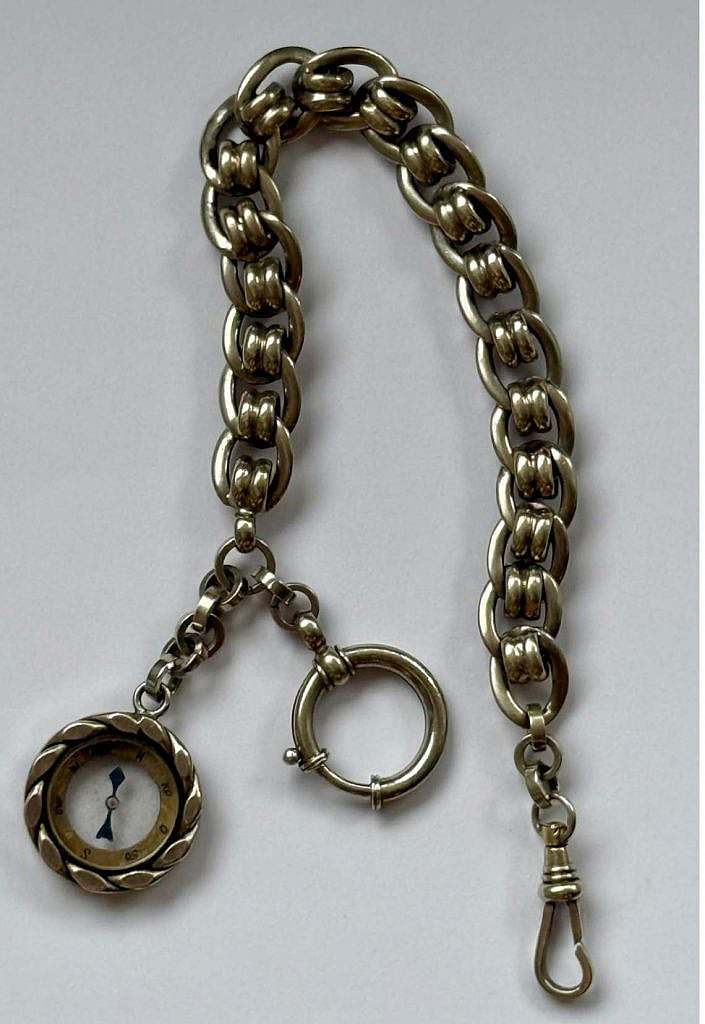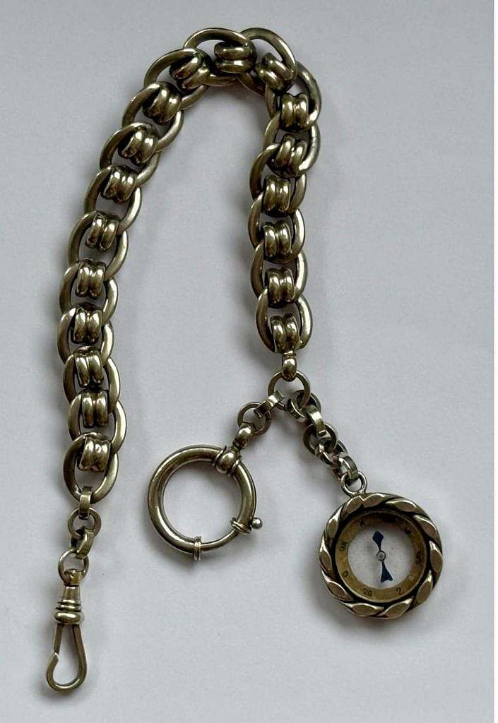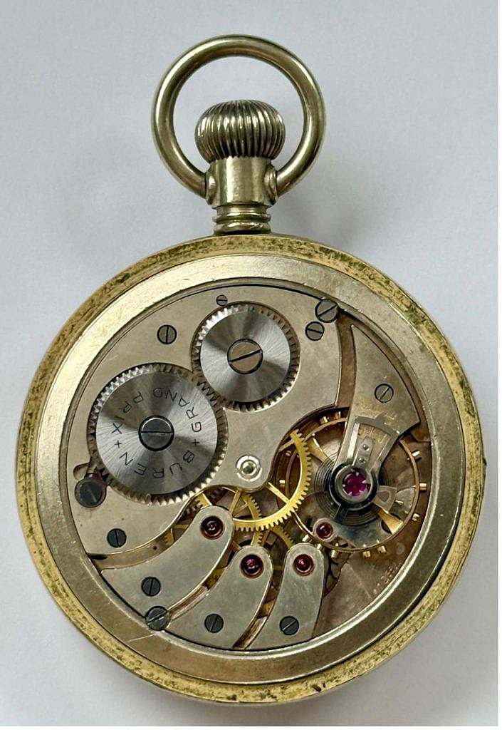 Reloj militar de bolsillo para piloto de aviación con cadena de plata e inusual brújula incorporada de estilo lepine con el colgante la anilla de suspensión y la corona ranurada a las XII. La caja es en níquel y cromo y la esfera es en esmalte inusual negro con segundero a las VI y la numeración horaria es arábiga dotada de radio luminiscente que permite la visión nocturna. Las agujas son de estilo esqueleto rellenas de radio luminiscente, también para la visión nocturna. El ejercito grabo su número de serie con la numeración 5.424 en su tapa posterior. La marca relojera en el interior de su tapa posterior ha grabado el número 58.242. La maquinaria es a tres cuartos a puentes, en el barrilete se ha grabado Buren Grand Prix.