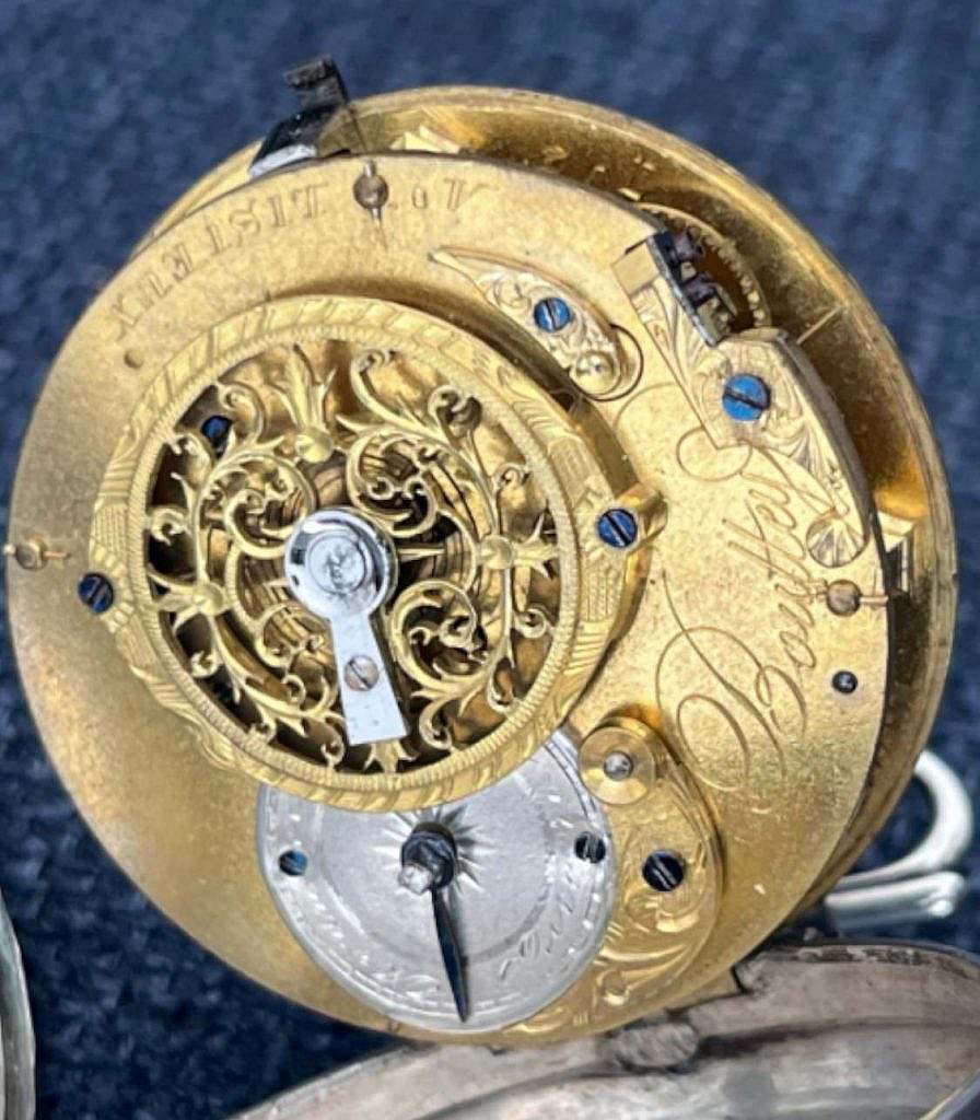 Reloj de bolsillo lepine con el colgante y la anilla de suspensión a las 12 con sistema de remontada a llave a través de la bocallave por la esfera a las 13 horas. La caja es de plata de ley de gran tamaño y el tipo de escape de rueda Catalina, construido por el maestro relojero Bouttery a Lisieux, Francia.