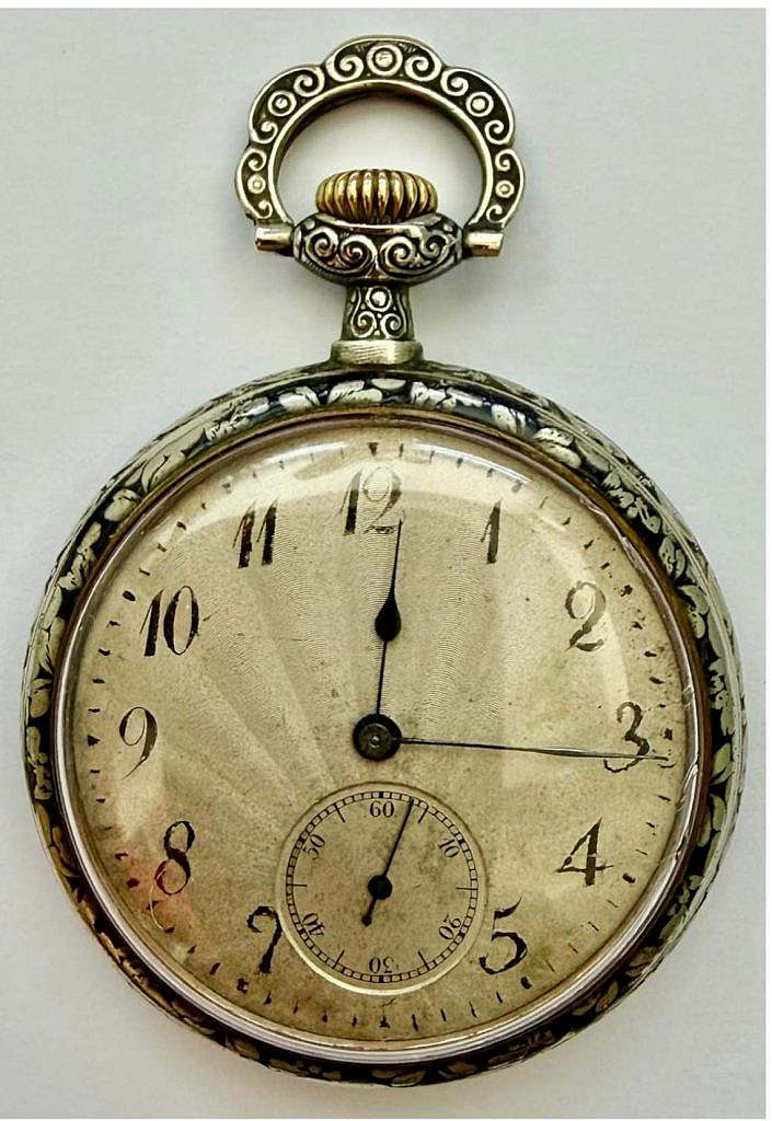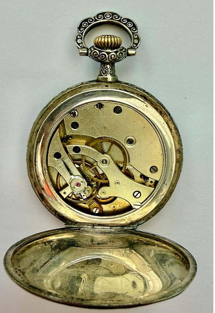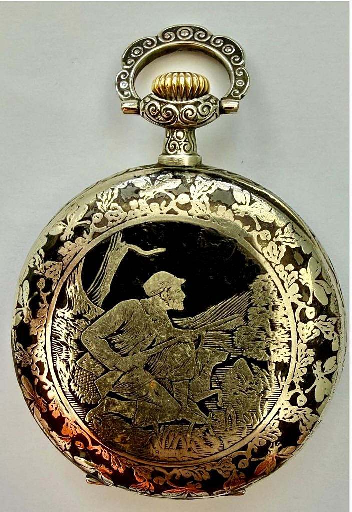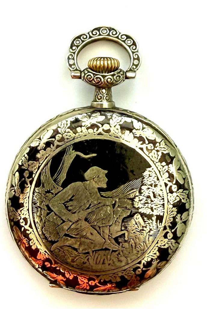 Nos encontramos ante un reloj de bolsillo en plata de ley cuya caja constituye, en sí misma, una auténtica obra de orfebrería gracias a su refinado trabajo de nielado con temática cinegética, un motivo especialmente apreciado en la relojería centroeuropea de finales del siglo XIX y comienzos del XX.