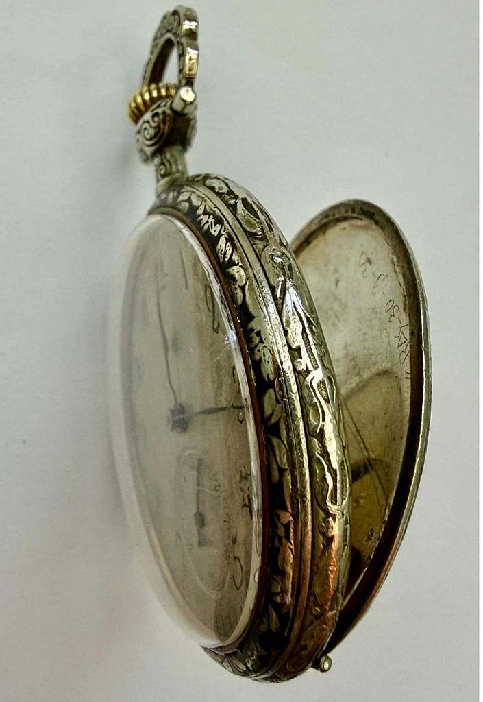Reloj de bolsillo en plata de ley con trabajo orfebre de nielado.