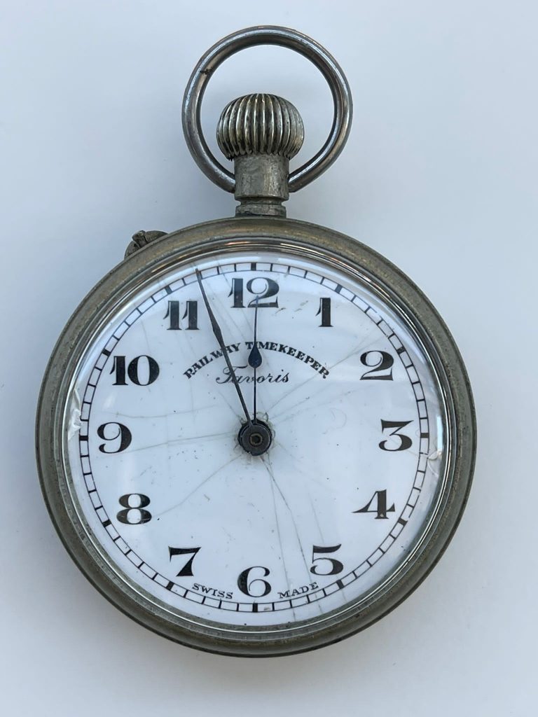 Reloj de bolsillo de la marca “Favoris Railway Time Keeper”, de estilo lepine, en plata de ley, con tapa posterior a rombos concéntricos apretados  y escudo central para grabar las iniciales del propietario, con una flor de lis grabada en su base.