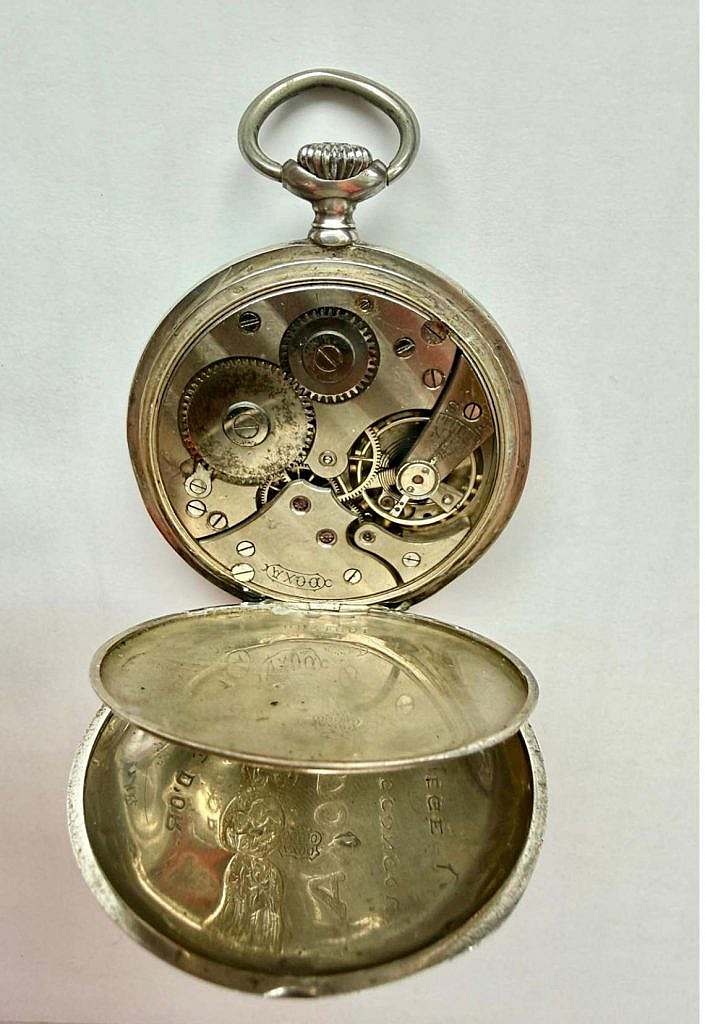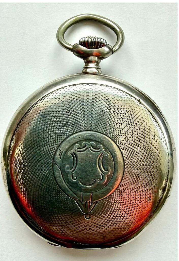 Reloj de bolsillo lepine de la marca DOXA, manufactura suiza, circa 1905. Caja en plata de ley, con anilla de suspensión colgante y corona ranurada original, su tapa posterior ha sido decorada con fino grabado guilloché geométrico tipo escama y cartela central para monograma. En el interior de la placa de características aparecen las inscripciones identificativas “DOXA – Hors Concours – Liège 1905 – Médaille d’Or Milán 1906”, alusivas a los reconocimientos obtenidos por la casa relojera en exposiciones internacionales de comienzos del siglo XX.