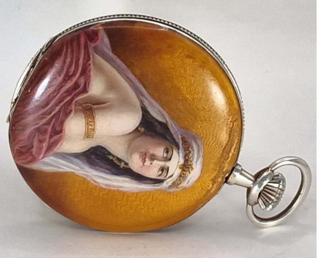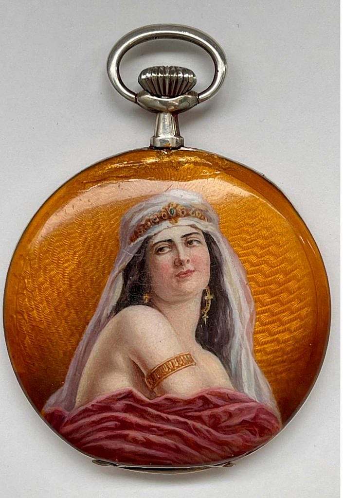 Reloj de bolsillo de estilo lepine con el colgante la anilla de suspensión y la corona ranurada a las XII que representa en un esmalte a la principal protagonista de las mil y una noches en justo homenaje a Sherezade.