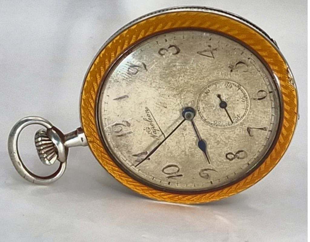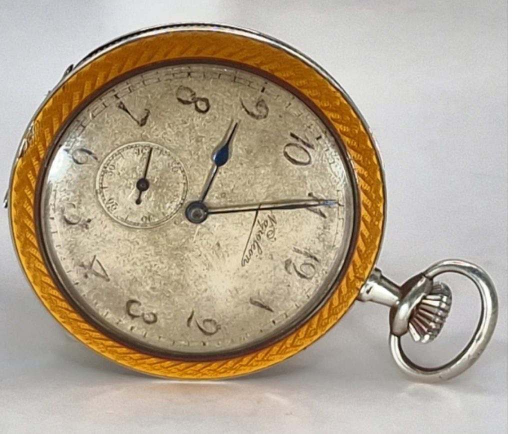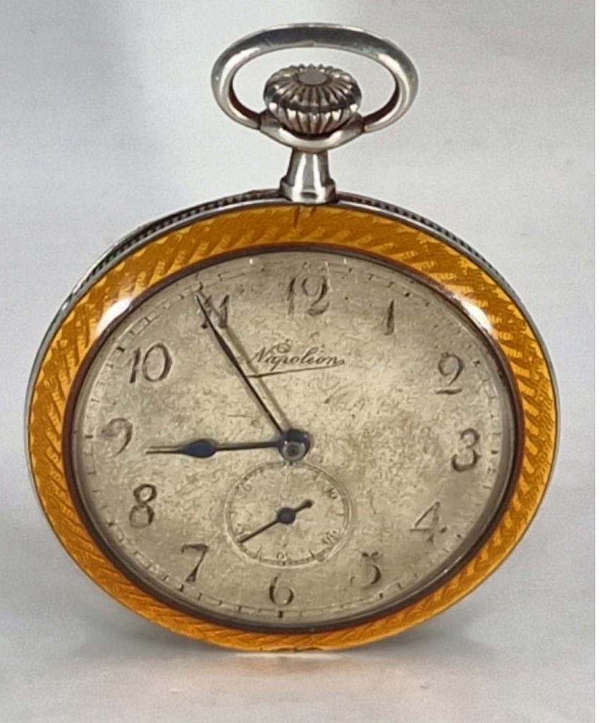 Reloj producido bajo la marca Napoleón de Maurice Rueff, Rueff Freres. Con la caja en plata de ley con profusión de esmaltes sobre grabado Guilloche sobre patrón de ondas.