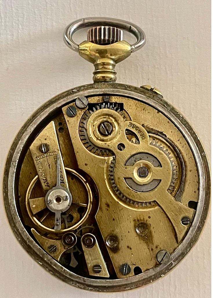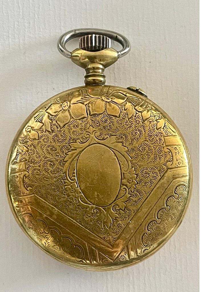 Reloj de bolsillo con caja lepine sobredorada con el colgante la anilla de suspensión y la corona rasurada a las XII, en su carrura en la indicación horaria de las XI se ha dispuesto el pulsador para el cambio horario. En su tapa posterior se han grabado unos motivos geométricos lineales que combinan con motivos vegetales y florales dando con el color dorado un gran realce y suntuosidad al reloj.