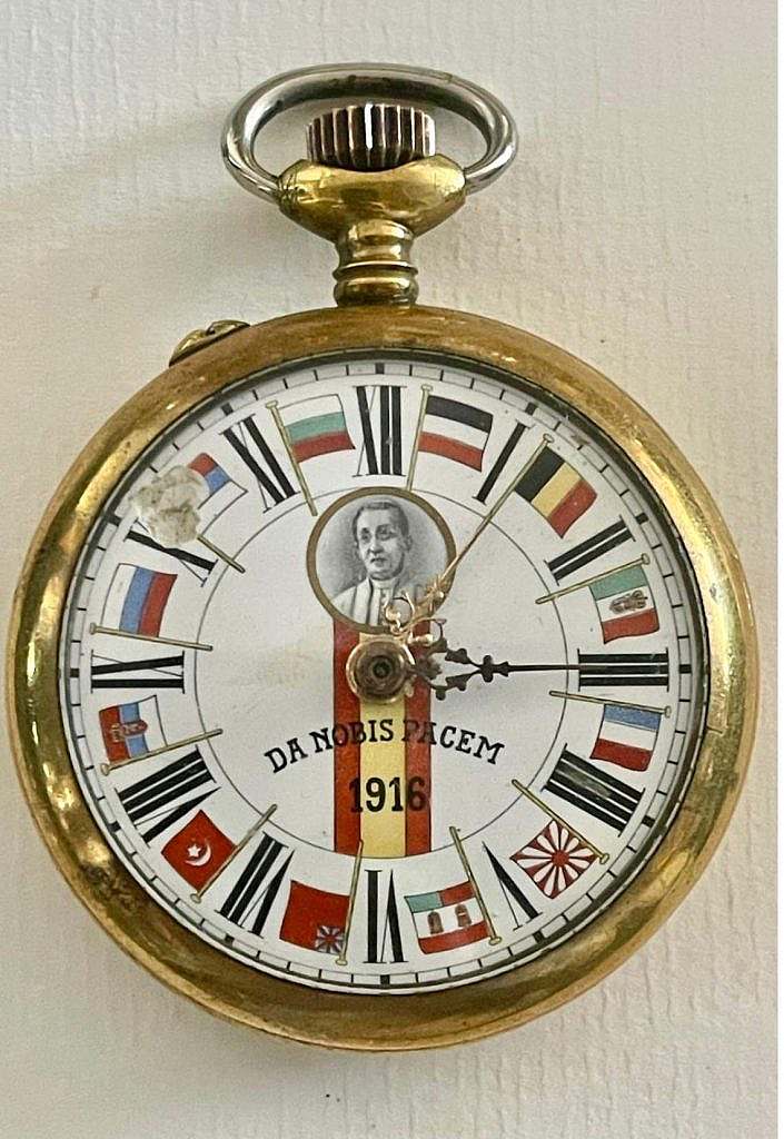 La frase acuñada en esmalte en la esfera de este reloj “Da nobis pacem” (Danos la paz) sobre la bandera española es un reflejo del llamado constante de Benedicto XV a la paz durante la Primera Guerra Mundial, y en el año 1916 este clamor se intensificó como un justo homenaje a los que sufrían. Benedicto XV, conocido como el “Papa de la Paz”, dedicó gran parte de su pontificado a intentar poner fin a lo que describió como una “carnicería inútil”.