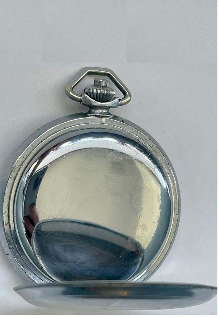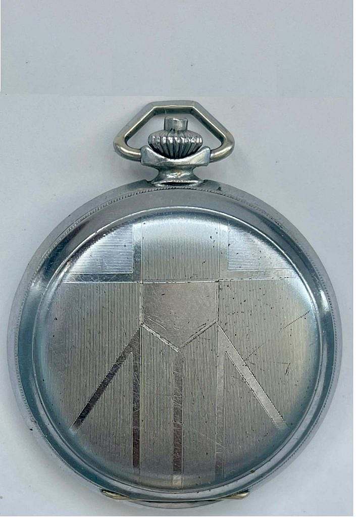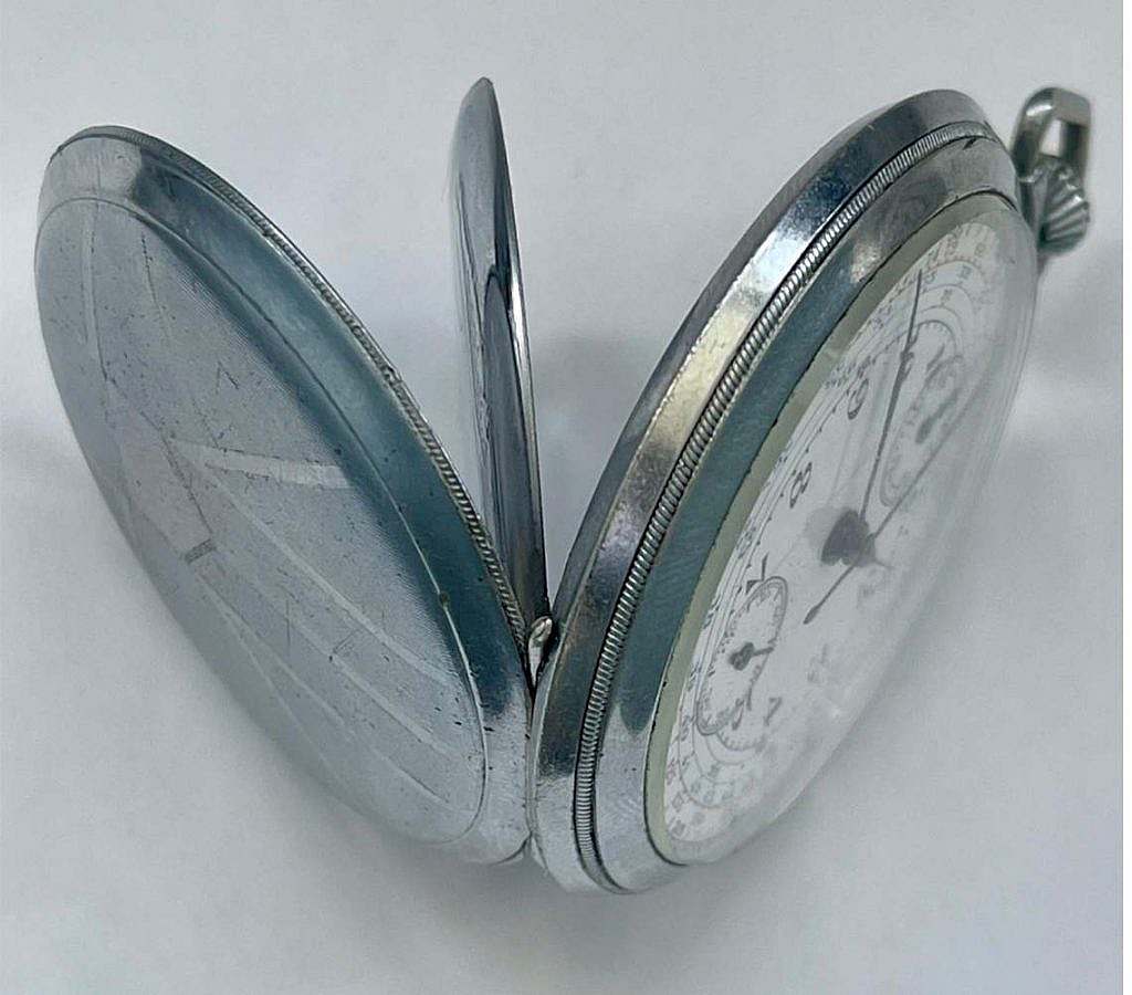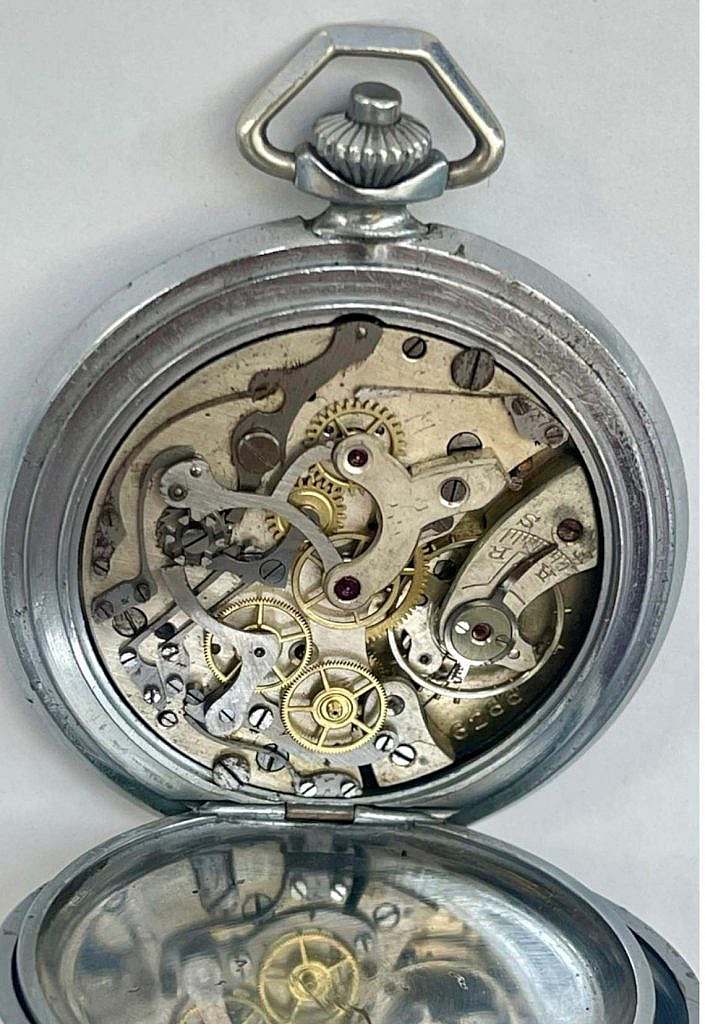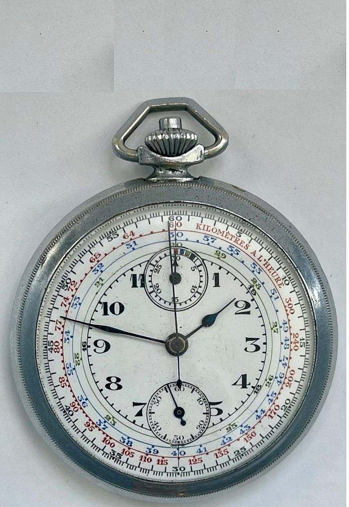 Reloj de bolsillo inusual de estilo Art-deco dotado de la complejidad del cronógrafo de precisión, taquímetro.