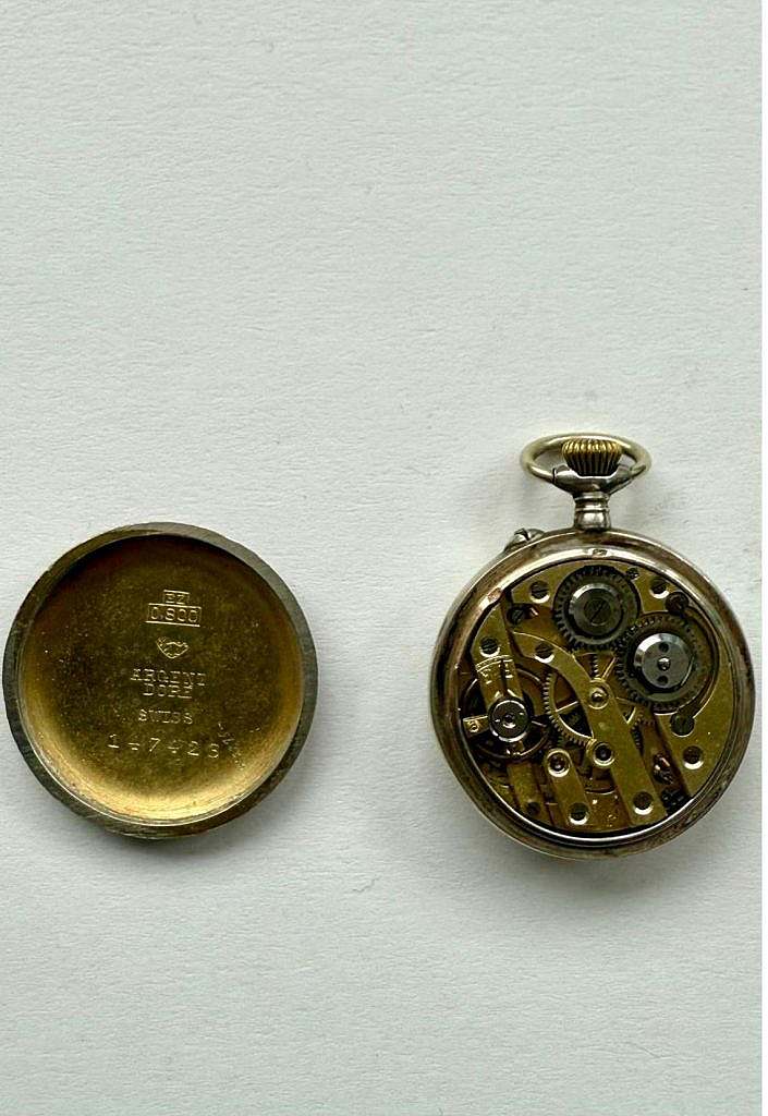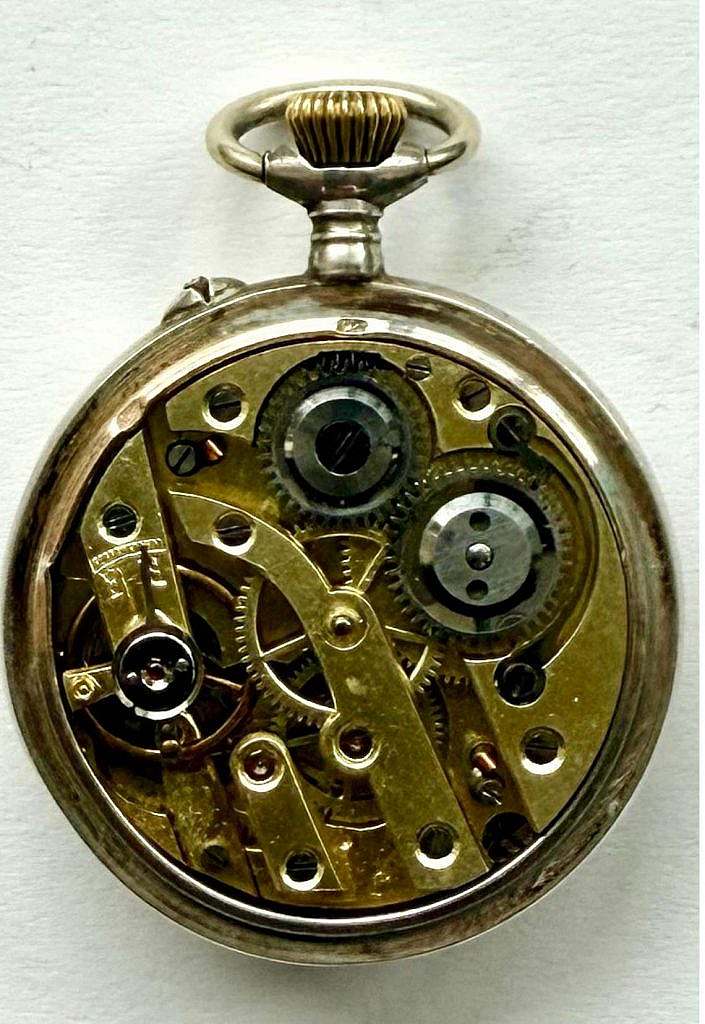 El movimiento mecánico, visible en la parte posterior, es de manufactura suiza, con platinas doradas, tornillería azulada y escape de áncora, dispuesto en un calibre redondo a puentes estilo “revolver”, característica constructiva habitual en los mecanismos de precisión de la época, que combina robustez y elegancia técnica. Todo ello evidencia la alta calidad y precisión relojera de este guardatiempos.