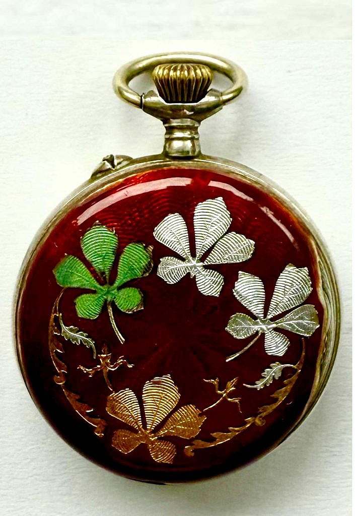 Reloj de bolsillo Joya para dama. Con grabado Guilloché esmaltado en rojo, con decoración vegetal de conjunto, formado por 4 hojas en color oro, plata y verde.