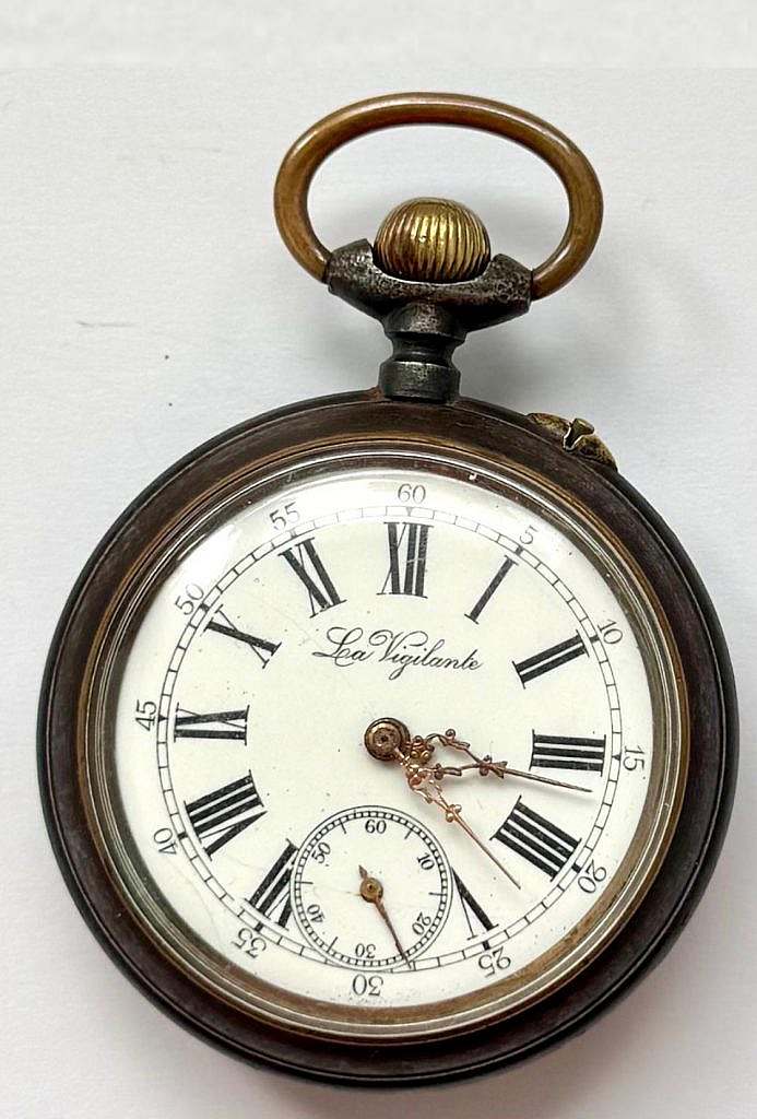 Reloj de Bolsillo de estilo lepine con el colgante, la anilla de suspensión y la corona ranurada a las XII. Reloj de la marca “La vigilante” perteneciente a la manufactura “JAPY FRÈRES & CIE”, Francia, Beaucourt, para el mercado militar español de la guardia de honor.