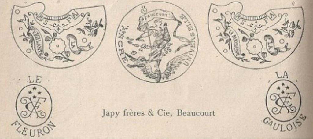 La imagen muestra varios sellos y marcas de la fábrica de Japy Frères & Cie, Beaucourt, una de las manufacturas relojeras francesas más influyentes del siglo XIX.