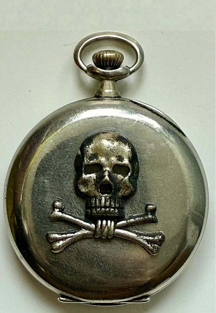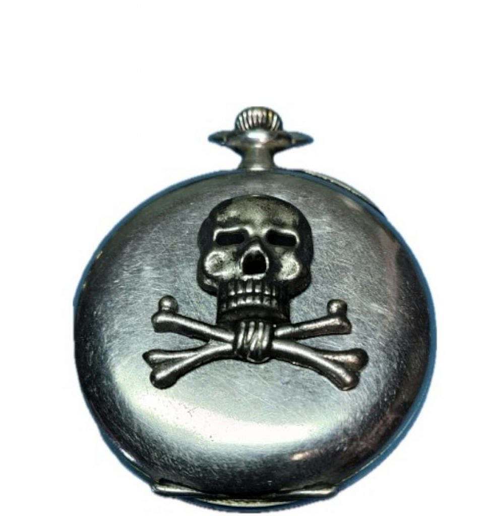 Esta simbología se extendió de forma natural a los objetos personales de servicio utilizados por los propios militares, entre ellos los relojes de bolsillo, que constituían una herramienta esencial para la coordinación táctica, la disciplina horaria y el mando en campaña. Los relojes de bolsillo con Totenkopf no fueron, por tanto, piezas decorativas civiles ni reinterpretaciones posteriores, sino relojes militares pertenecientes a húsares y oficiales de estas unidades, que incorporaban el emblema en la tapa posterior, el guardapolvo o mediante grabados y aplicaciones metálicas, reafirmando visualmente su pertenencia al regimiento y su compromiso con los valores que este representaba.
